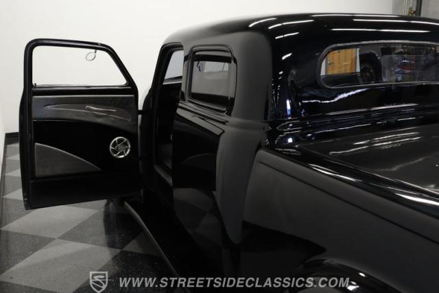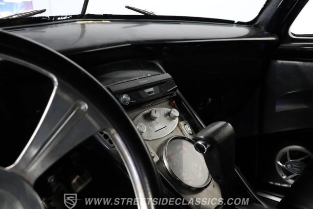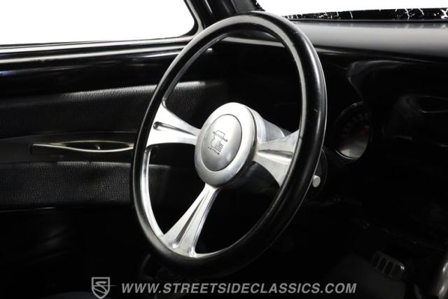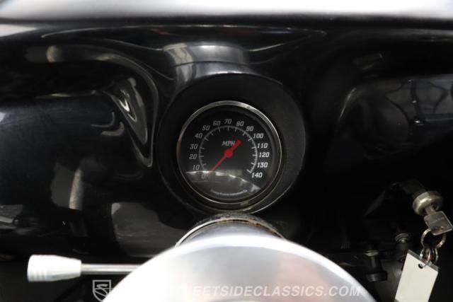 Inside, we find a nicely done, custom black vinyl interior. A custom center console provides storage while separating a pair of late-model, supportive bucket seats. A power-assisted, Billet Specialties steering wheel sits on a tilt column and just ahead of a single, large 140-mph speedometer. Fuel, temperature, volts, and oil pressure are efficiently displayed within a single large bezel at the base of the center stack, while Vintage Air HVAC controls and power window switches are all thoughtfully placed in a unique custom setup. A Pioneer AM/FM/AUX offers Bluetooth connectivity, while the rear suicide doors make ingress and egress easy for any rear passengers who want to be a part of this exciting ride.