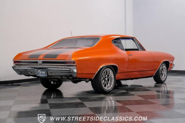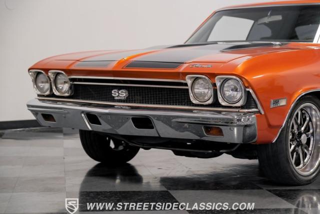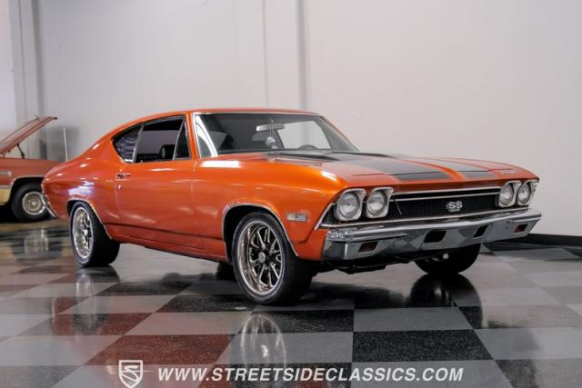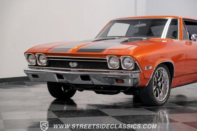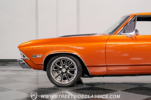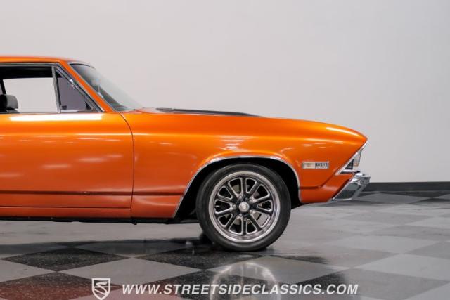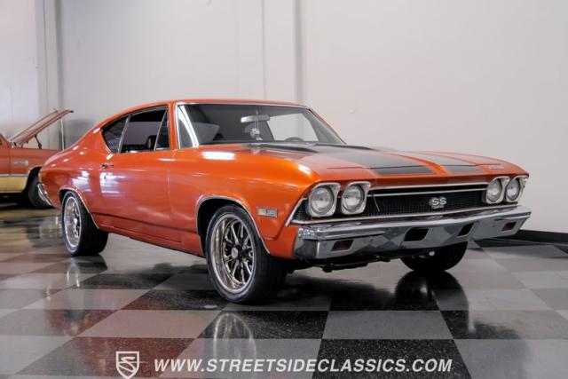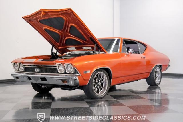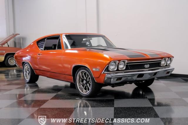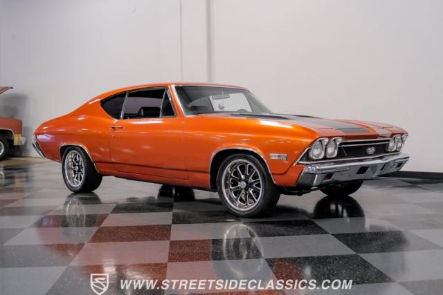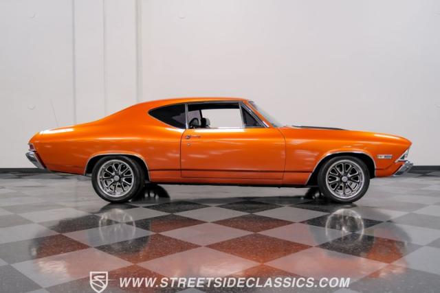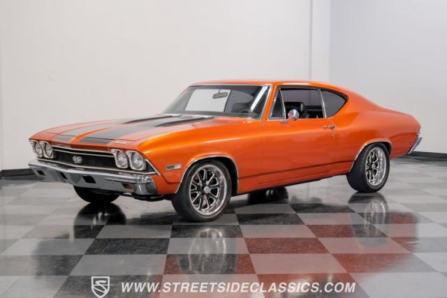 Ladies and gentlemen, start your engines and feast your eyes on this fire-breathing, asphalt-devouring 1968 Chevrolet Chevelle Malibu SS Tribute. Clad in an eye-catching Inferno Orange Metallic paint job that\'s as bold as a sunrise after the darkest night, this beast doesn\'t just roll down the street; it makes the pavement quiver. Accentuated by aggressive black stripes that trace its muscular contours like the scars of street battles won. It sits proudly on 17\" US Mags rims, shod in 225/45R17 rubber, ready to grip the road or burn rubber, depending on how you\'re feeling when you hit the gas. The blacked-out grille and tinted windows hint at the rebel heart beating within, while the clean lines and sparkling chrome bumpers front and rear ensure it\'s always dressed to impress.
