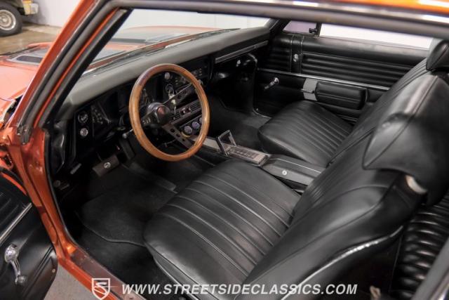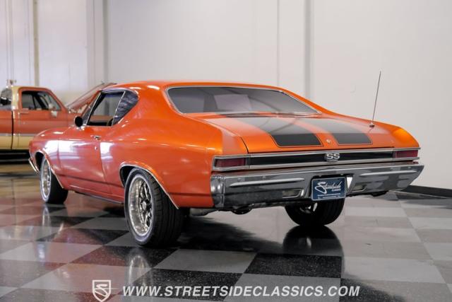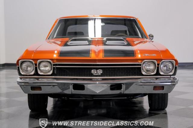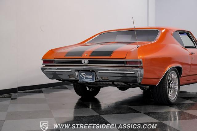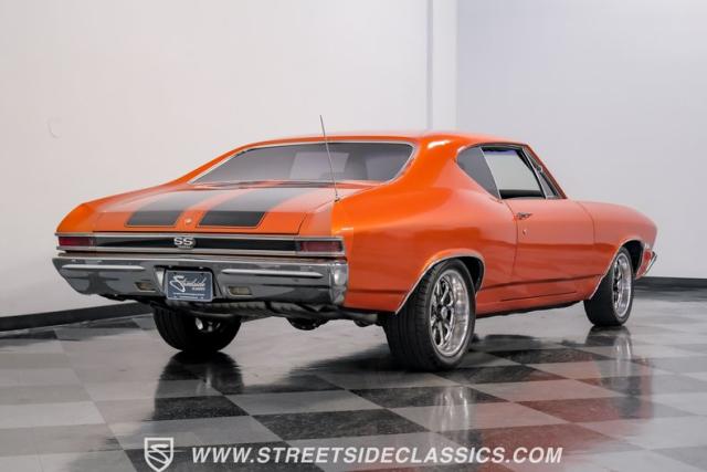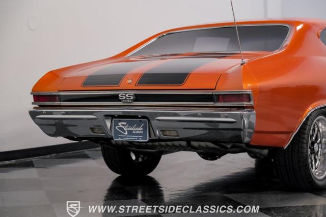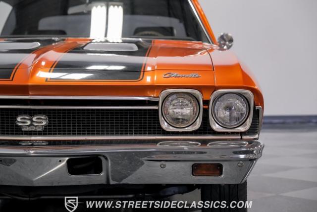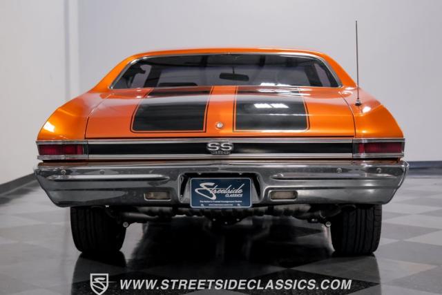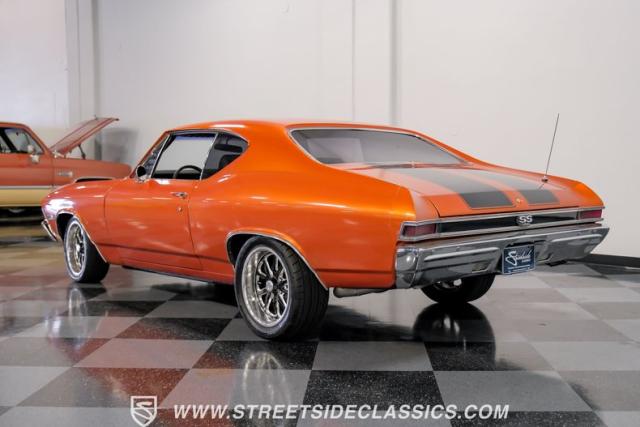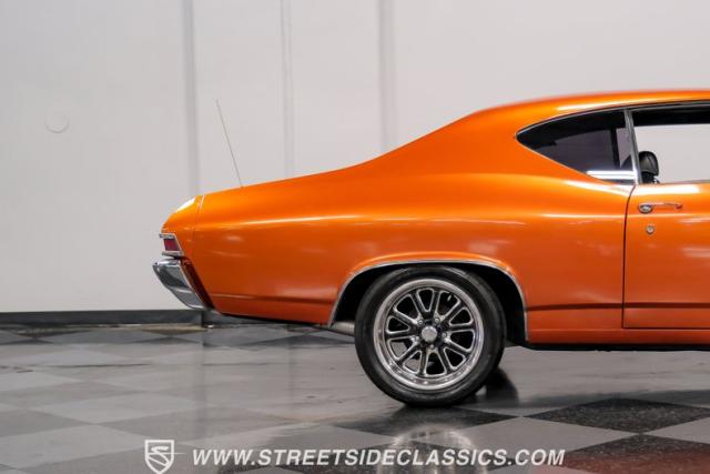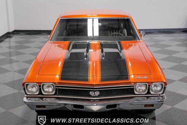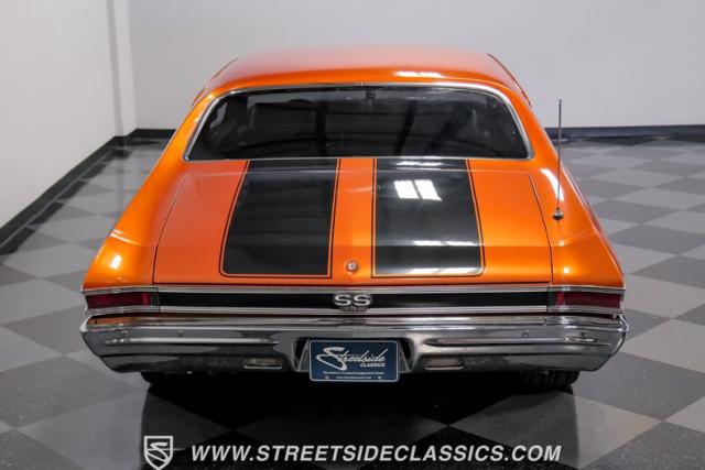Ladies and gentlemen, start your engines and feast your eyes on this fire-breathing, asphalt-devouring 1968 Chevrolet Chevelle Malibu SS Tribute. Clad in an eye-catching Inferno Orange Metallic paint job that\'s as bold as a sunrise after the darkest night, this beast doesn\'t just roll down the street; it makes the pavement quiver. Accentuated by aggressive black stripes that trace its muscular contours like the scars of street battles won. It sits proudly on 17\" US Mags rims, shod in 225/45R17 rubber, ready to grip the road or burn rubber, depending on how you\'re feeling when you hit the gas. The blacked-out grille and tinted windows hint at the rebel heart beating within, while the clean lines and sparkling chrome bumpers front and rear ensure it\'s always dressed to impress.