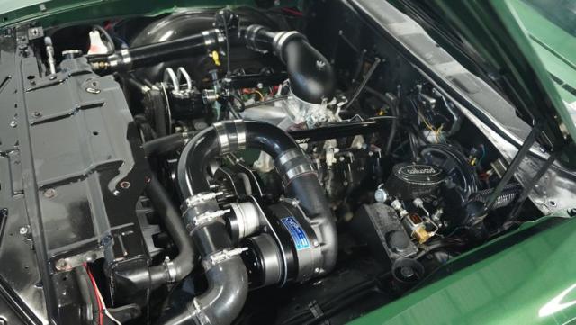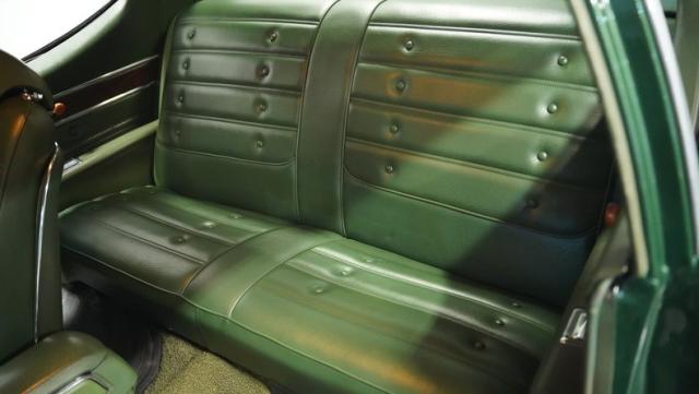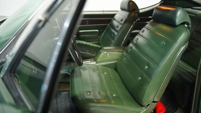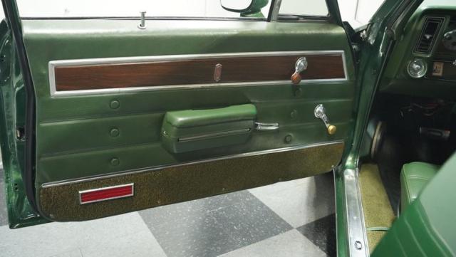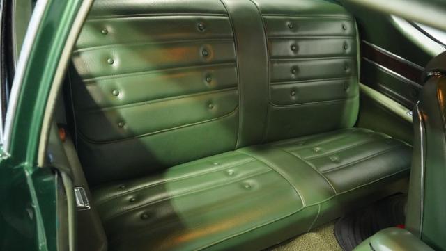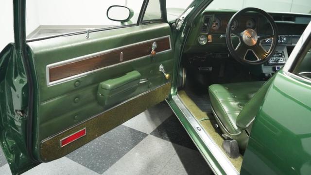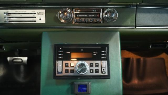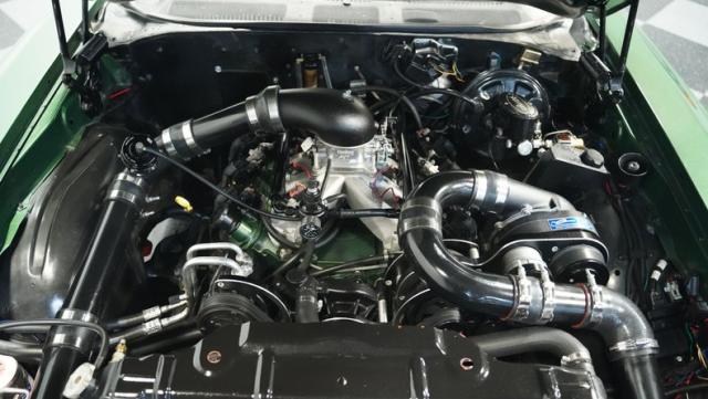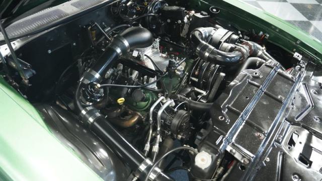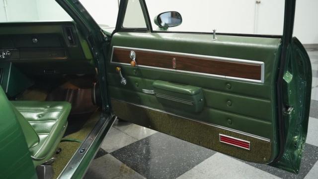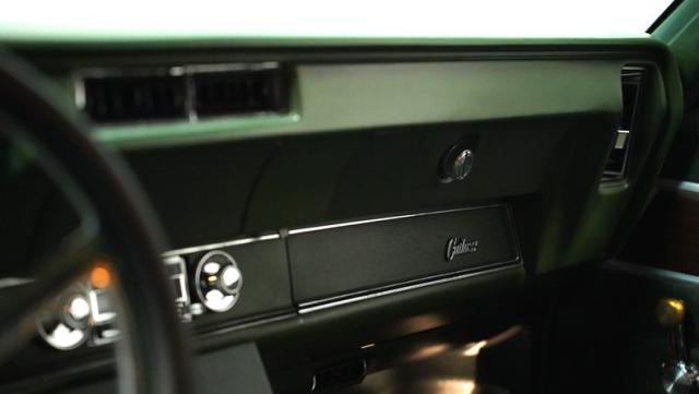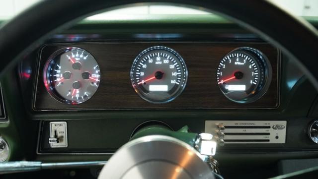 Green vinyl wraps the cockpit in pure muscle car DNA. Performance bucket seats keep you planted while the custom-built console houses some serious audio firepower. The Dakota Digital dash glows with precision data while the custom steering wheel puts total control in your hands. This sound system brings the thunder with dual head units, 4.5-inch kick panel speakers, 6x9-inch deck lid speakers, and three 10-inch Skar subwoofers in a custom trunk setup. Power steering and air conditioning make every cruise comfortable.