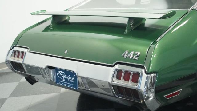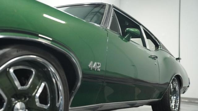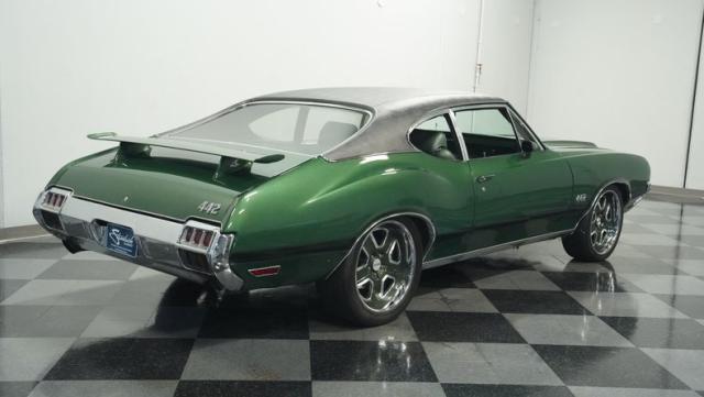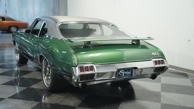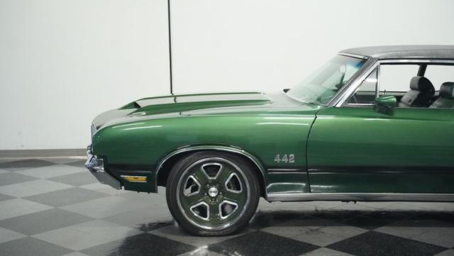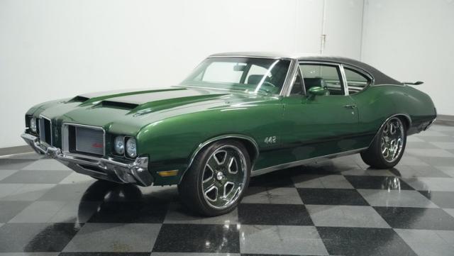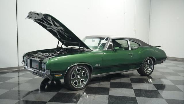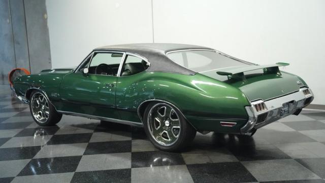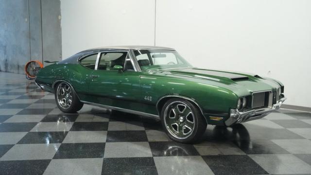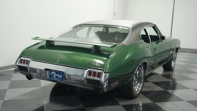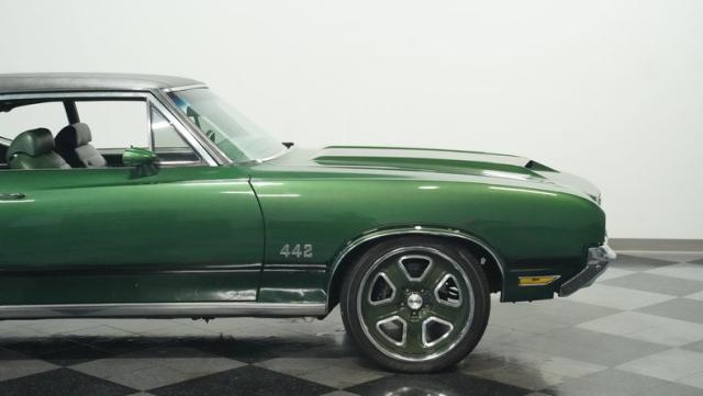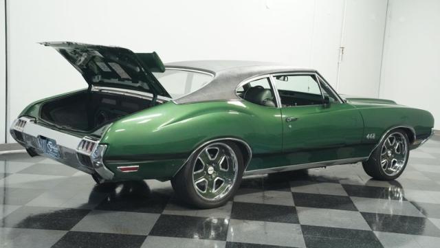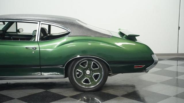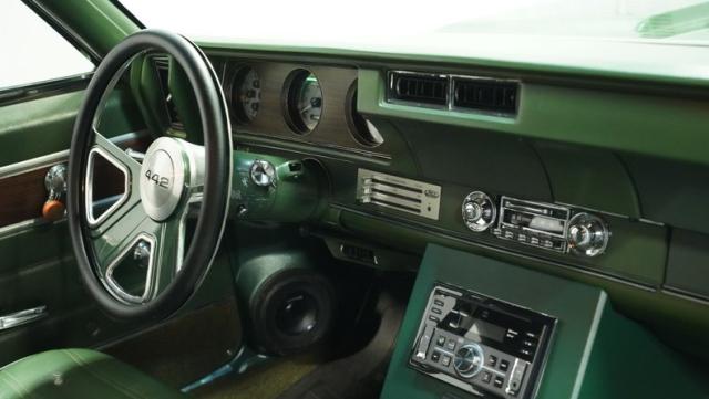 This 1972 Oldsmobile Cutlass 442 Tribute flexes serious muscle, where classic Detroit iron meets modern performance engineering. The Sequoia Green paint lays down a foundation of power matched by bold black stripes and black vinyl top. A wicked stance comes courtesy of those killer 20-inch replica wheels, featuring unique floating 442 hub caps that stay dead-level while rolling. Up front, the fiberglass hood shows off pure performance attitude, while LED lighting front and rear lights up the night. Massive 245/40R20 front and 275/40ZR20 rear tires plant this machine firmly on the street.