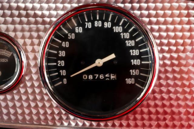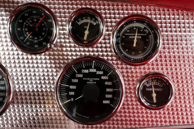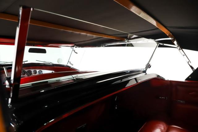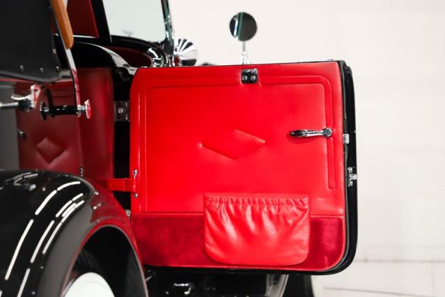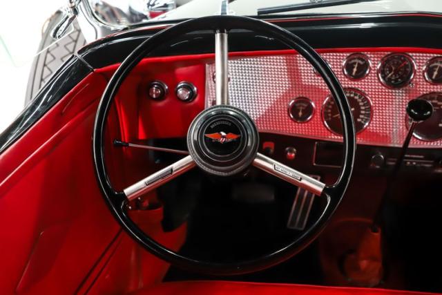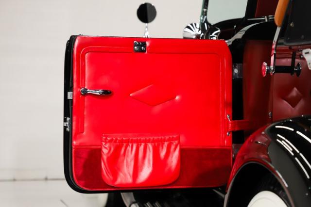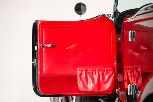 INTERIOR: This is a very rich and authentic looking interior. It has genuine red leather upholstery throughout and fresh red carpet. The dash is also very authentic with a machine turned panel, authentic style gauges including an altimeter and beveled glass lenses. The automatic floor shifter looks like the original 3-speed manual. In back the cowl lifts up to get in and out and there is an a/c-heat vent.