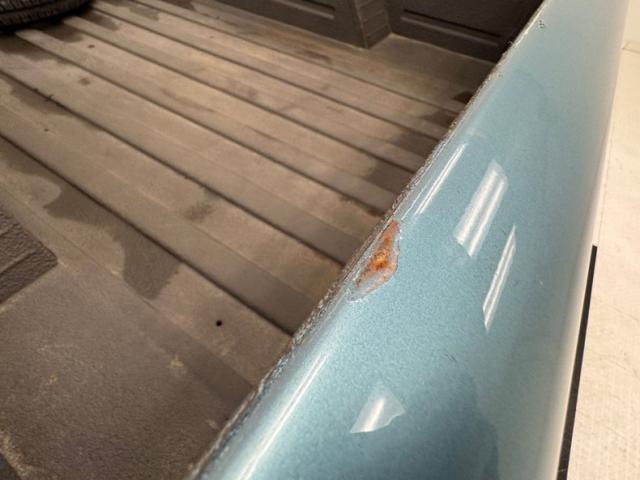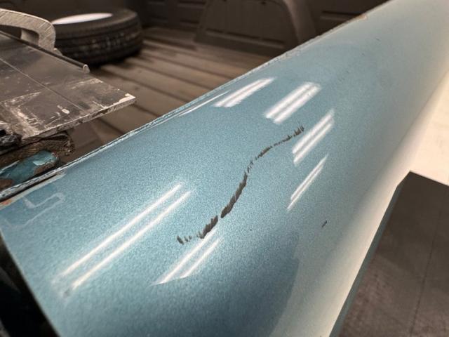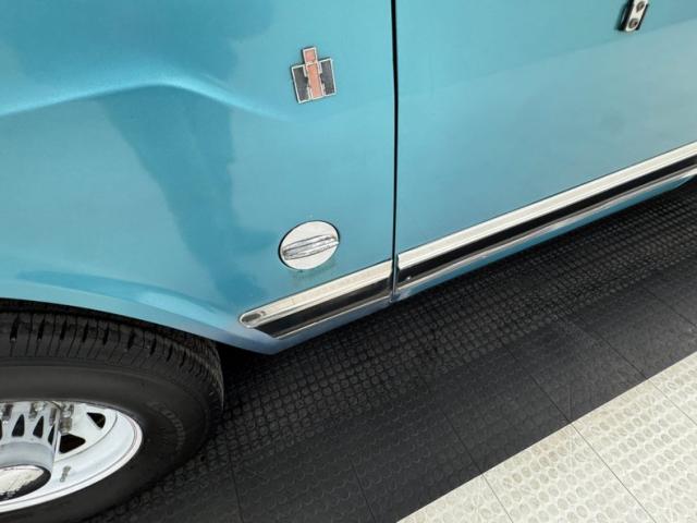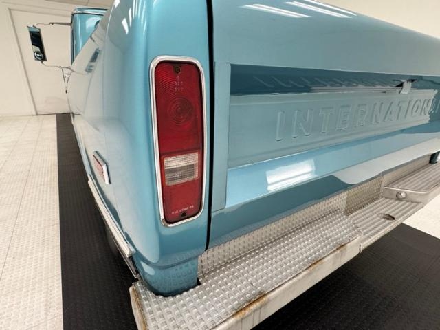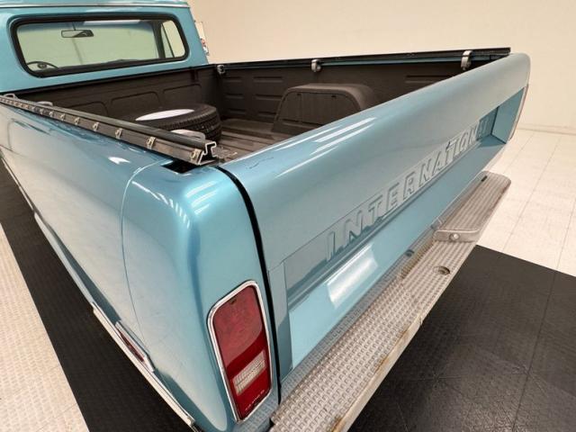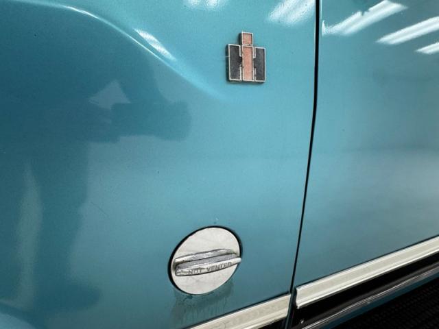 This handsome unit has had one repaint, according to our consignor, in the original Medium Blue, and it shines brightly under our lights. The IH trademark of simplicity also shines through with single headlights in the horizontal grille and polished bezel over a wrap- around chrome bumper while wide mirrors flank the boxy cabin. Things are kept unassuming out back with basic tail lights, a stamped tailgate, and a steel topped, heavy duty bumper. The bold trim on the side, a black band bordered by polished trim, is a nice visual connector to the 16-inch American Racing wheels, here wrapped in LT rated tires. There\'s a clean bedliner and snaps in place for the tonneau cover that comes with the truck. At a distance, it looks fantastic but our crack staff and their magnifying glass pick up some typical imperfections including scratches, chips, spotting, discoloration at both fuel fills, light bubbling, and a detaching bumper topper.