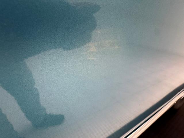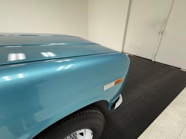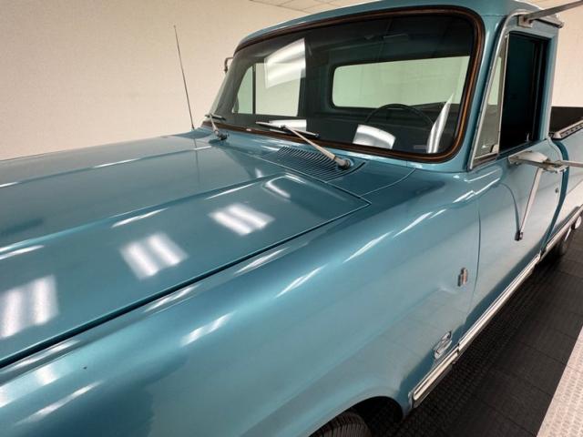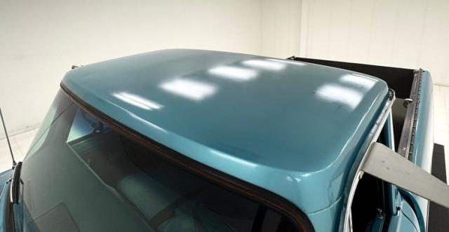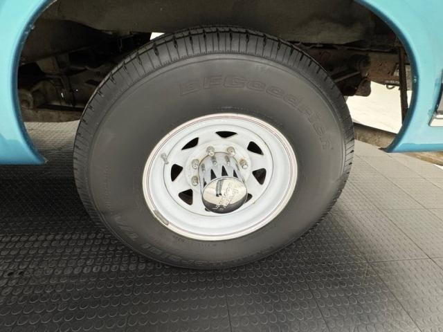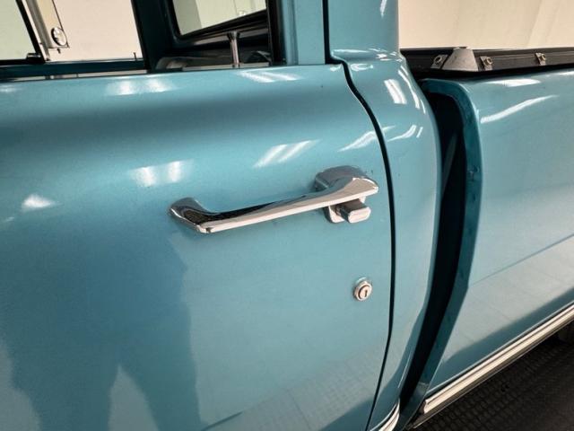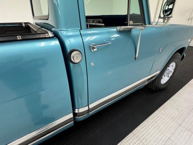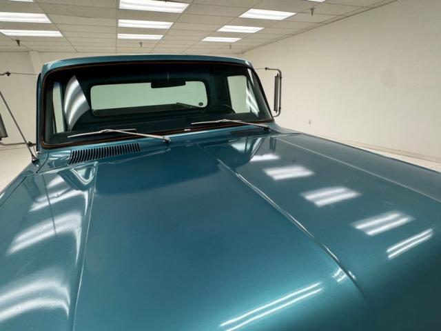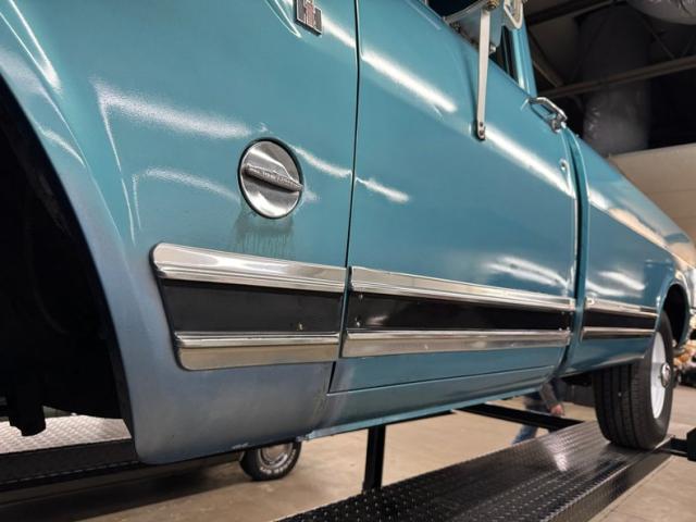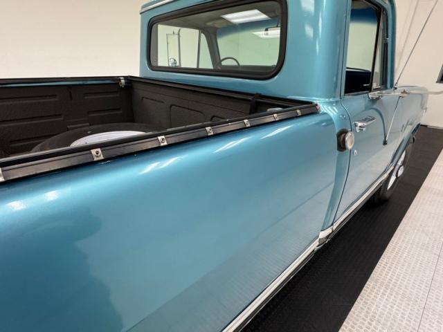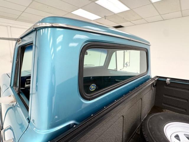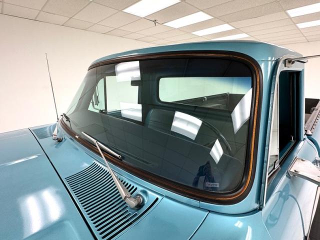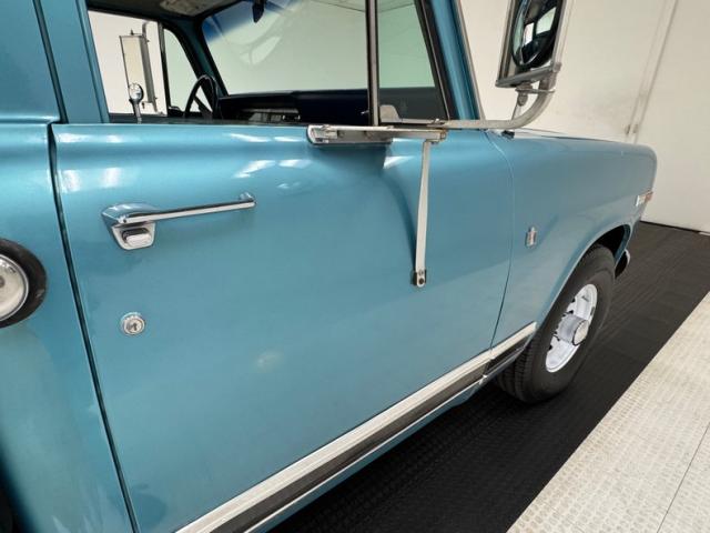 Blue vinyl door cards show some patina and a ding or two in the steel panels, a testimony to this truck\'s working days. A patterned and textured vinyl bench seat also shows some age, but is fully intact and completely presentable behind a simple steering wheel and equally unpretentious dashboard with horizontal instruments and a row of metal knobs. The dash pad appears newer and rounds out a clean control center over a grain vinyl coated floor, in blue, where the shifter rises from the transmission tunnel. Up top, a perforated white headliner is in place.