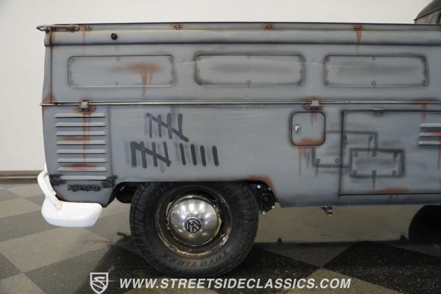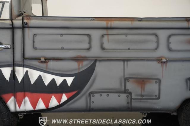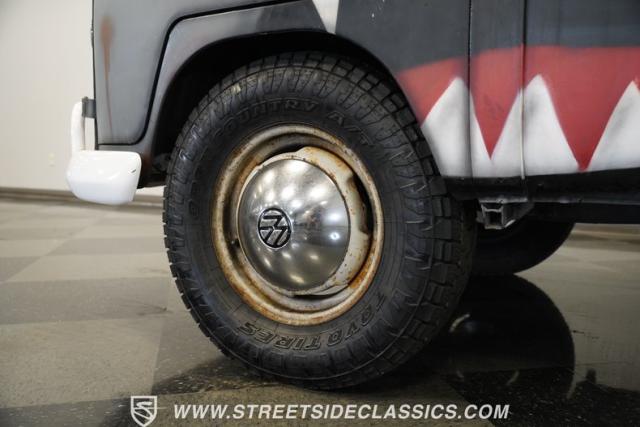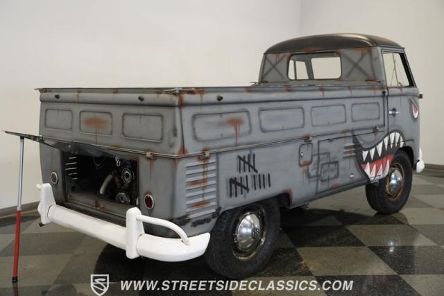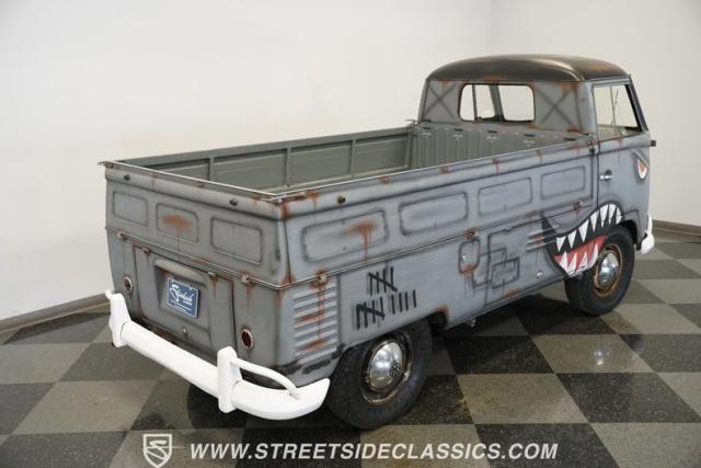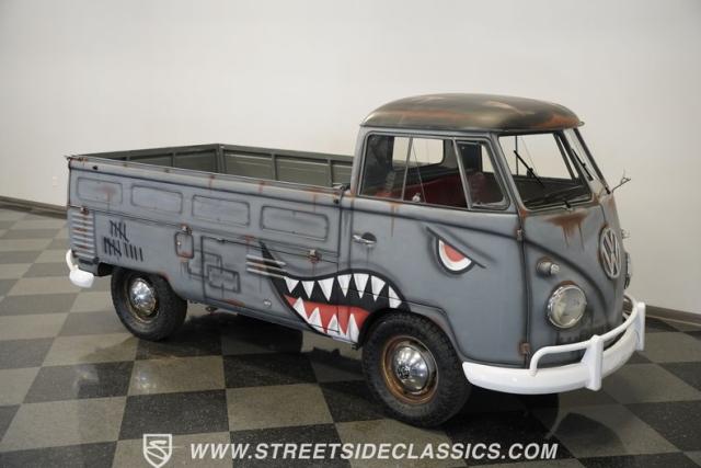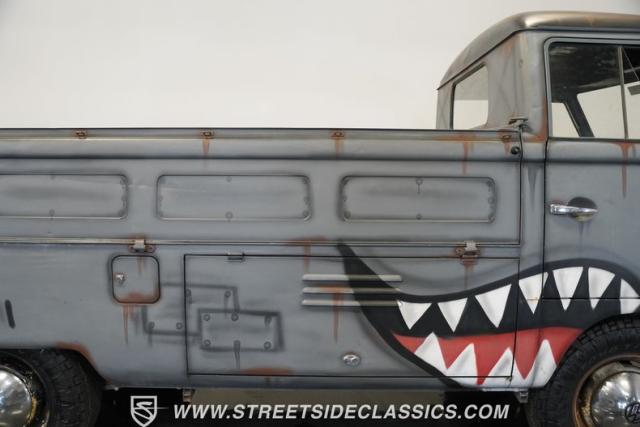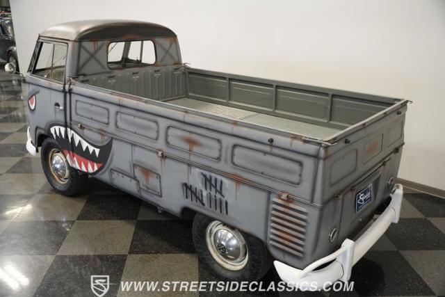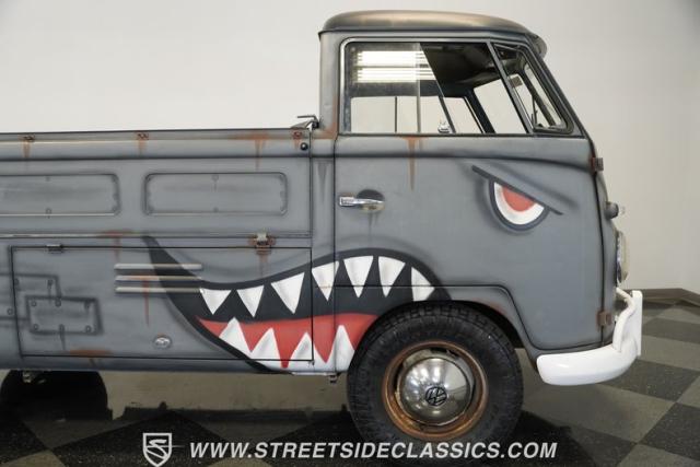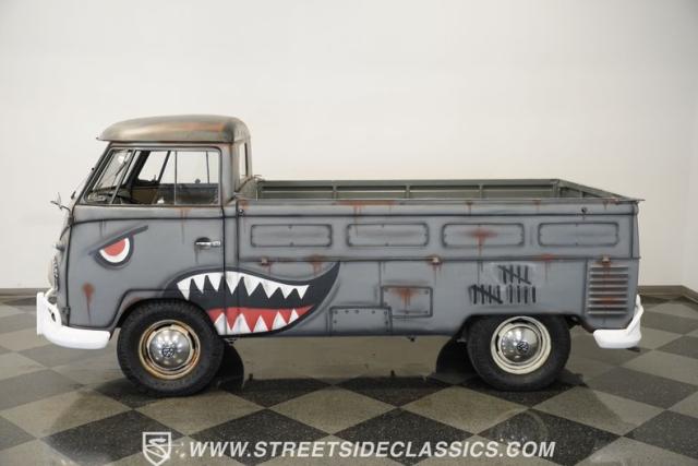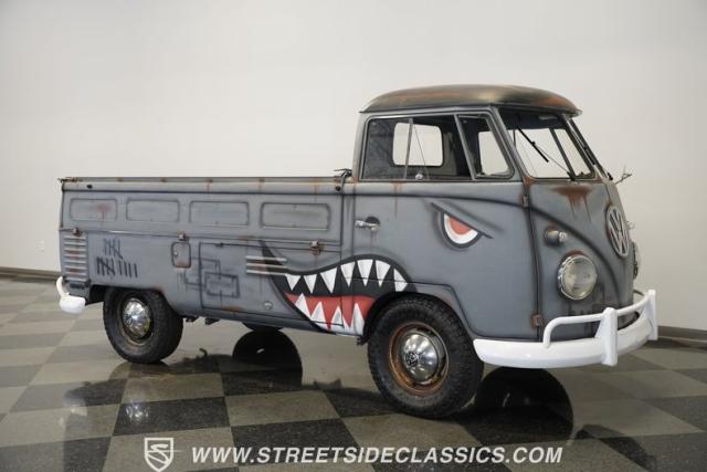 Adorned with WWII fighter plane-inspired shark graphics, the 1959 Volkswagen Single Cab Pickup Type 2 makes an immediate visual impression. Gray paint provides the perfect canvas for the custom shark artwork, giving this German commercial vehicle a unique personality all its own. The bed offers practical cargo space, while the sturdy 15\" steel wheels with VW center caps provide the foundation for the 215/75R15 Toyo Open Country AT tires. Every angle of this classic hauler displays the simple, functional design that made these VW trucks such workhorses.