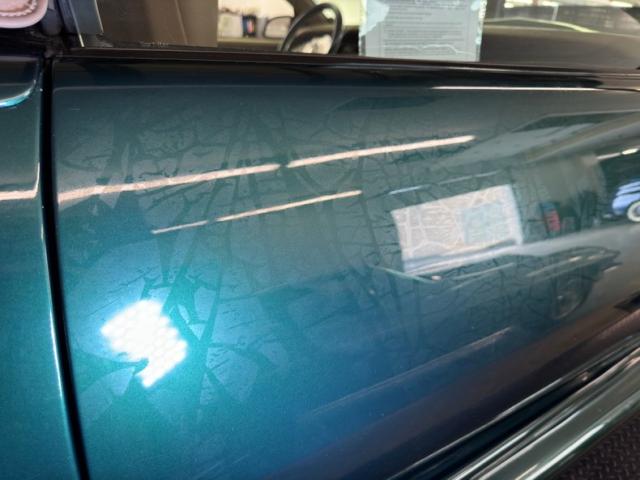 Dark Jade Green Metal is noted here and according tothirdgen.org, only 30 convertibles were painted this color, while another 310 were straight Green Metallic making green a rare color for \'92 convertible Trans Ams. The dual snout on the hood is balanced in appearance by the inset marker and fog lights on the front fascia that look somewhat like intake ducts. Let\'s look at the car in profile where some notable features present themselves. Deeply ridged cladding lifts from the door and continues onto the rear quarter while an extra body part below the rocker panel gives the illusion of side pipes and we\'ll describe it when we get the car up on a lift. Meanwhile, airbags on the car have failed so a fixed position lift kit has been added and creates lots of space between the 16-inch wheels and the wheel openings. With the top down, the straight shoulder line travels back to a rear wing, then a 90 degree turn down the vertical tail. That tail is adorned with a one year only taillight design which has been augmented by a couple of Firebird decals. Imperfections include scuffs and chipping on the cladding, discoloration or deglazing of the clear, various scratches and scuffs.