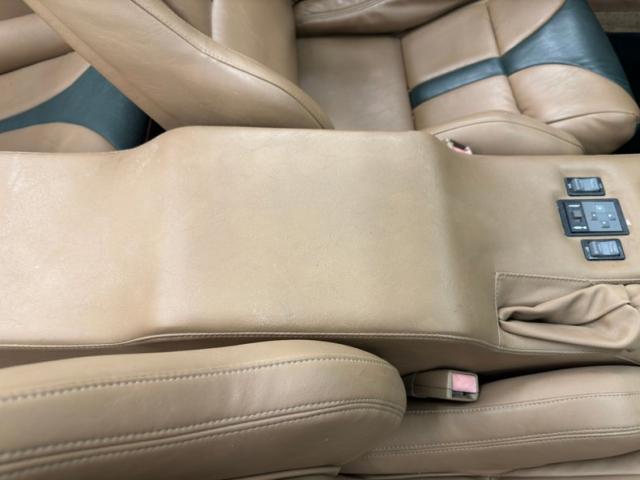 Custom work inside combines tan leather with green and starts on the door panels where a swooping green armrest is surrounded by contouring embossed accent lines. The Trans Am bucket seats wear a green stripe that flares at the very top and very front of the seat bottom and this pattern in mirrored in the rear 2+2 seating where tan, stitched leather make up the side walls and house speakers, while flanking the center console which is a boxed unit that flows from the front seats. Other than some wear on the driver\'s seat, the buckets are in good condition. A winged steering wheel fronts a custom dash, now fitted with digital gauges and Trans Am is embroidered on the passenger\'s dash. The center stack is the beginning of the center console and includes the A/C controls and an AM/FM/CD radio. The console flows down to meet the shifter and e-brake, now booted in tan leather. Low pile tan carpet shows some age and usage and is covered with green, carpeted mats that continue the contrasting palette.