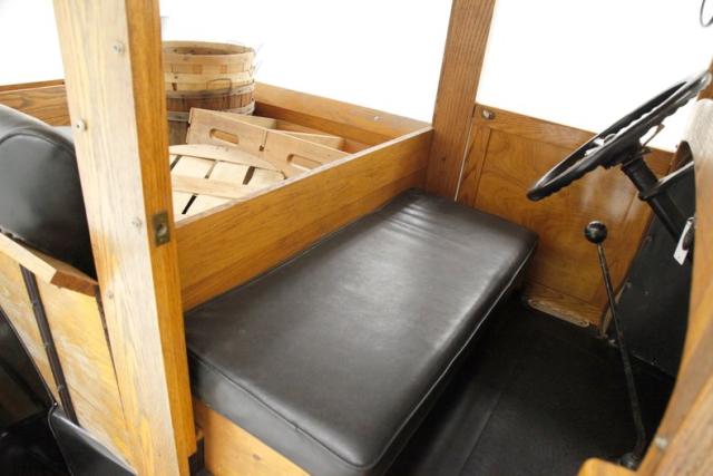 A tree\'s worth of oak covers most surfaces of the door panels with the only deviation being the screw style door releases. Inside, a long smooth black vinyl split bench seat runs door to door and does come with the upper seat section. More wood makes up the vertical surfaces of the interior and the headliner, all looking like new. The full metal jacket dash fronts the bench and is painted body matching beige around a center chromed \"mask\" style shiny instrument cluster. A nice shiny original steering wheel is mounted and extending proudly from this nice dash and textured vinyl in black covers the wood and steel front floor. Moving rearward to the cargo area, we note barrels, baskets and a Detecto scale all fitting snugly into the well restored wood bed.