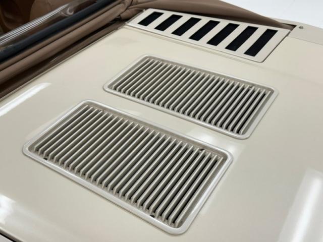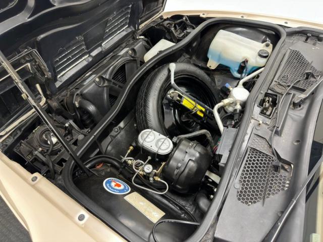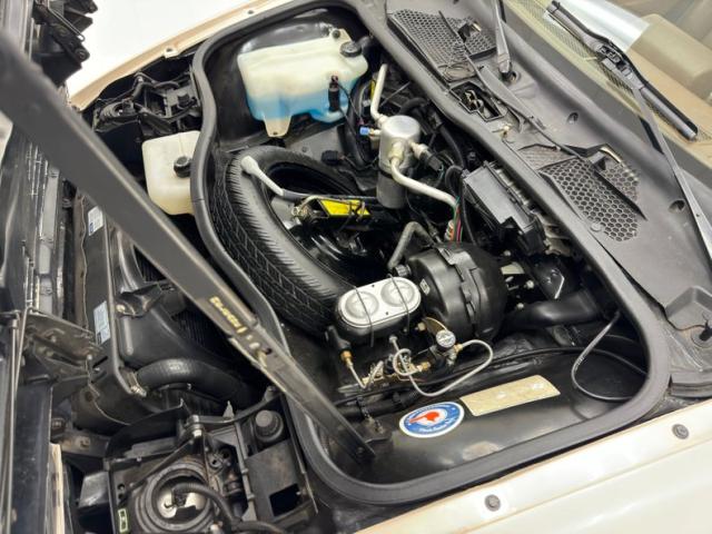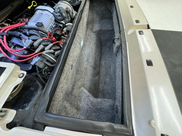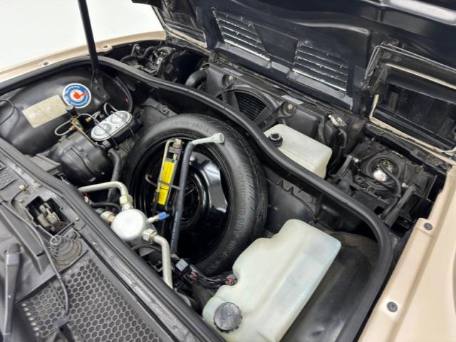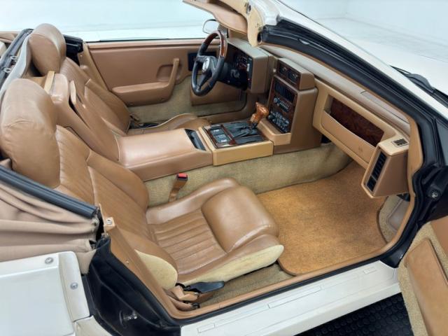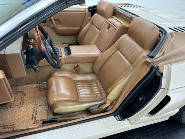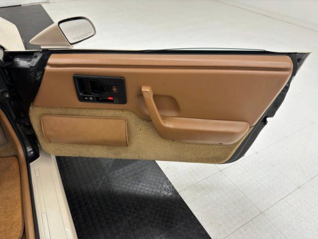Saddle is a nice contrast to the white and starts on the standard Fiero doors with plastic panels and a carpeted lower. The tall buckets seats are sporty, and both show some age with the driver\'s seat presenting with patina creases and light cracking of the leather. A sporty Isotta steering wheel sets the pace with a top woodgrain feature, and this translates to the dash, center stack, center console, and right dash which all feature faux burlwood applique. The shifter also has a faux burl wood handle and while not typically a Ferrari feature, it does bring the otherwise plastic paneled Fiero interior up a notch with glossy woodgrain coverage. The gauges, radio, A/C controls and switchgear are all Fiero. A weathered and rather ill fitting storage bin rises vertically between the seats and tan loop carpet covers the floor.