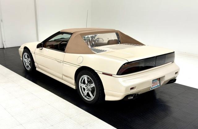 Pearl White is a tasteful choice, as most tributes are red and yellow and it adds a touch of realism to the alterations which start with the well done front fascia and in this case, no prancing horse has been added. Hood vents, engine vents, and side scoops add to the illusion and 16-inch Motegi wheels are a fitting addition. The GT\'s black tail light panel resembles the shape and contrast of the 355 while the tan canvas roof creates sporty flying buttresses and a flat top which can be removed targa style or the whole thing dropped or a spider profile. The black side molding has been color keyed with the body as have the side mirrors. The quad exhaust do not veer from Fiero GT configuration and fit well with this tribute. Imperfections include scrapes under the chin, chipping paint at the cladding seam, and various paint runs, chips, and cracks.