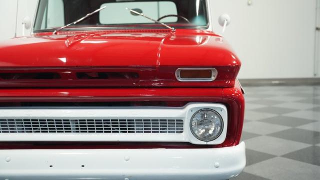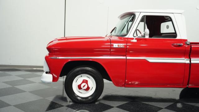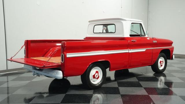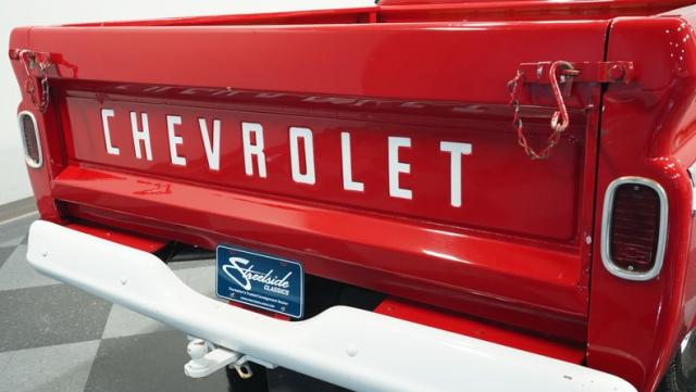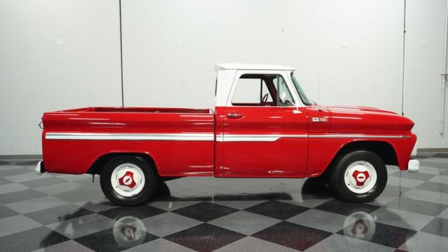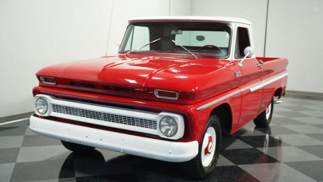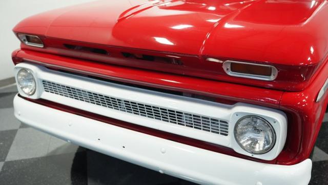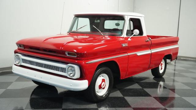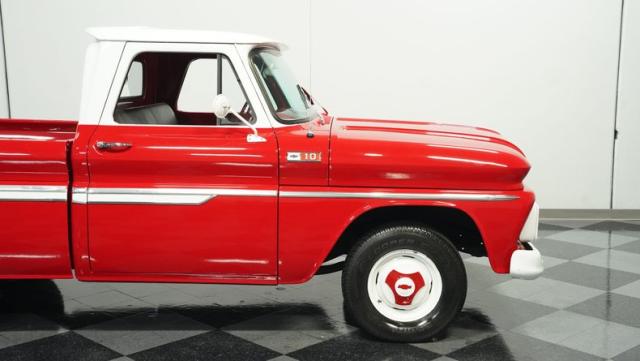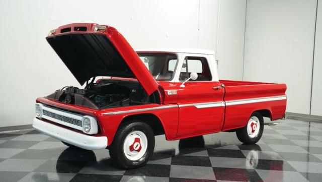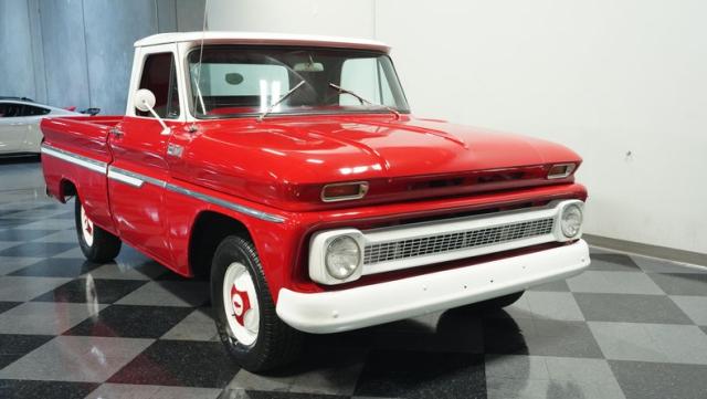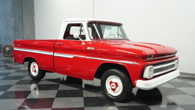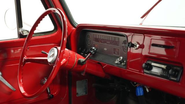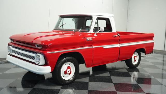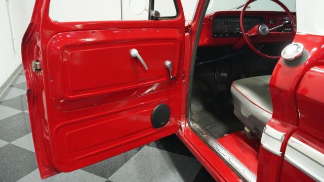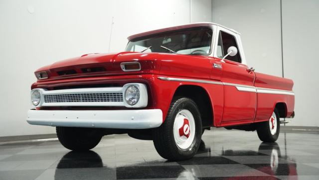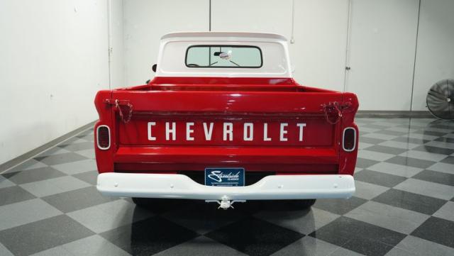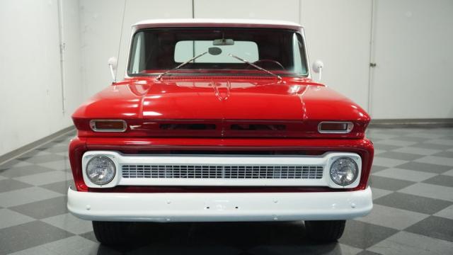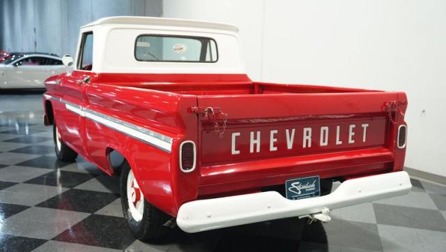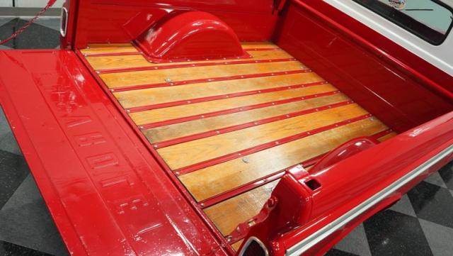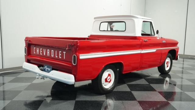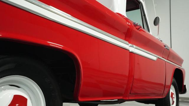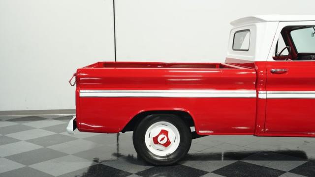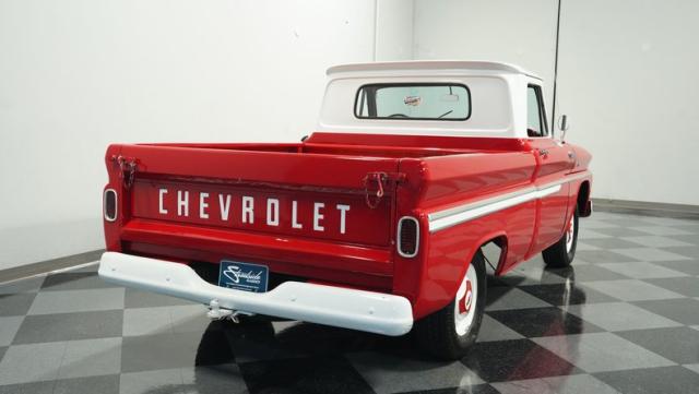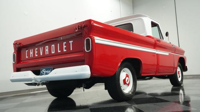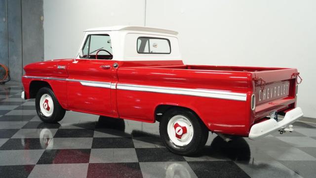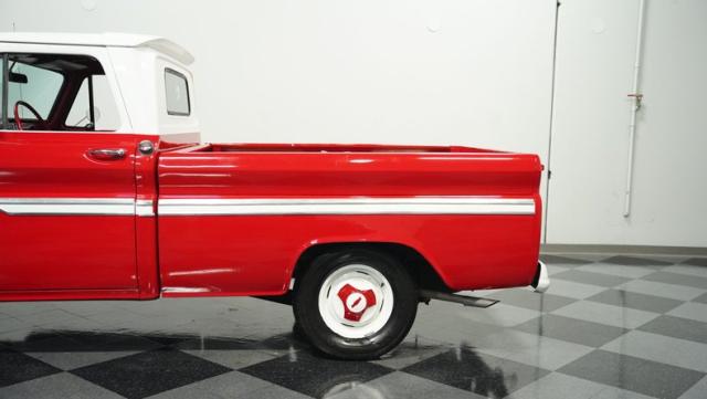 Here is something rarely seen today - a 1965 Chevy truck that is mostly stock and never significantly modified. This beautiful 1965 Chevrolet C10 Fleetside short bed pickup is configured much as it was when it left the dealer\'s lot new. Finished brilliantly in Cardinal Red with a Pure White roof, this truck has a factory original feel and is full of character. The painted white grill and bumpers, as well as the color matched original steel rims with red and white painted hubcaps add to the nostalgic look of this classic C10. The wood planked bed floor is in great shape, as well as the factory bright side moldings and factory style rear view mirrors.