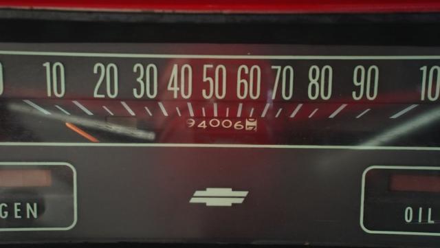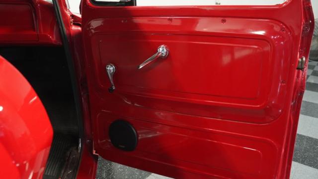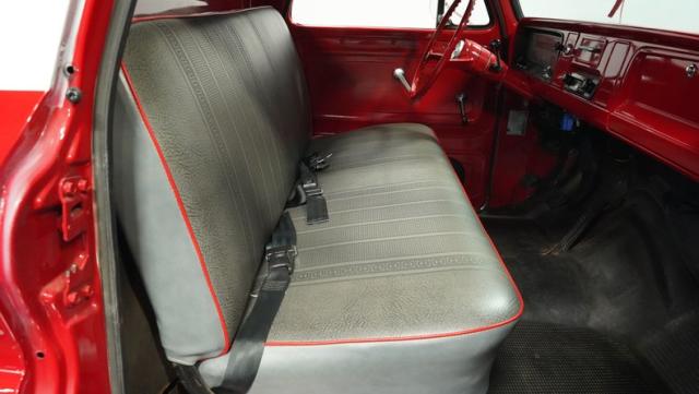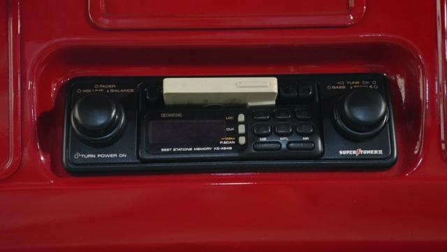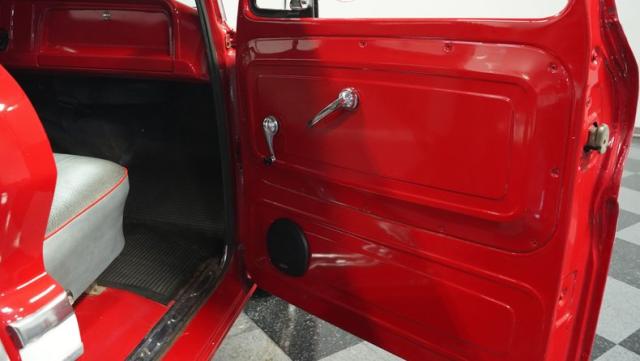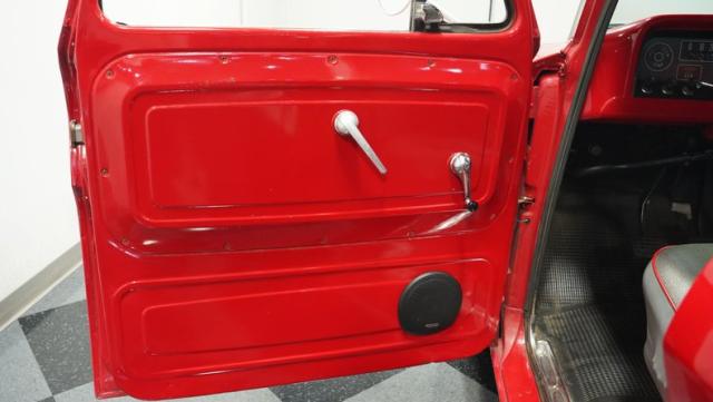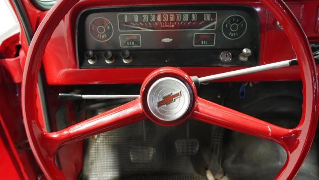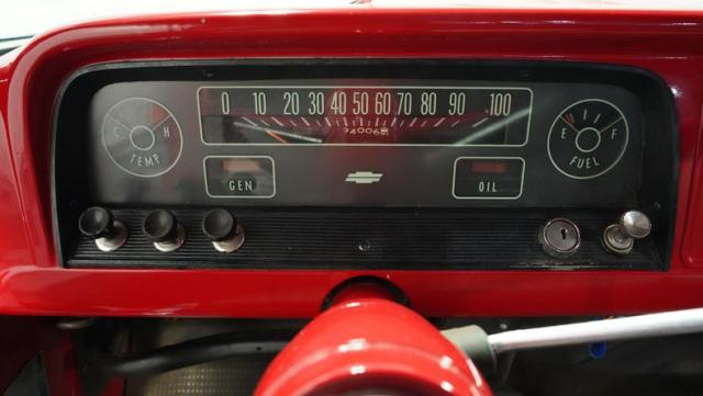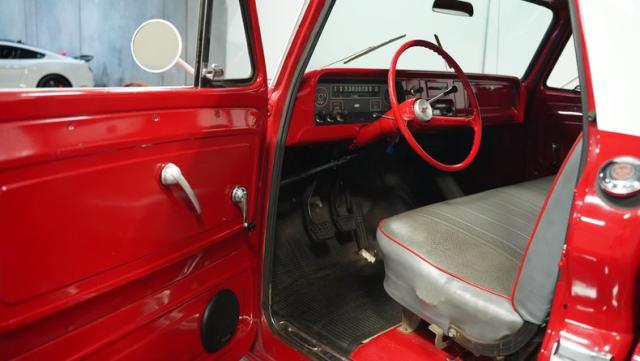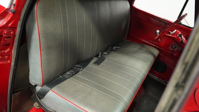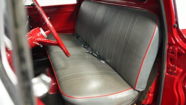 Inside, the gray vinyl seat has contrasting red piping that coordinates with the red painted, mostly metal cab interior. The factory steering wheel, dash gauges and knobs are still in place. The only modern upgrade is a stereo radio. Even the black rubber floor covering is still present.
