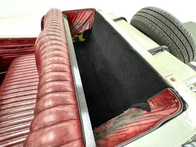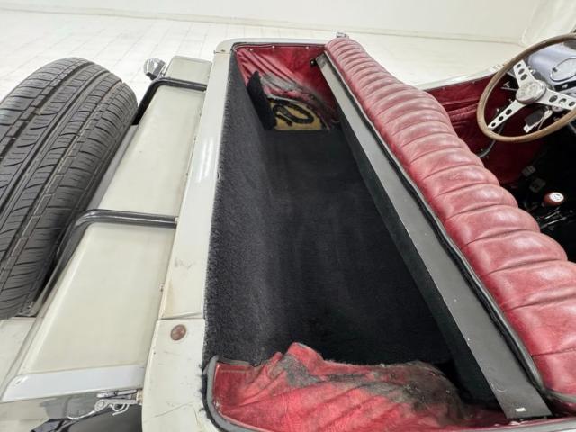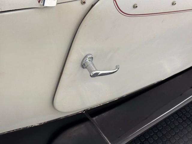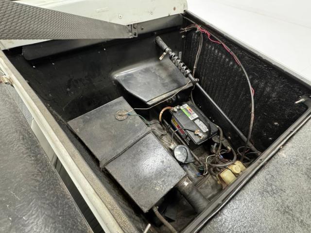 Marbleized Oxblood vinyl is used as the interior palette with the door panels that include large map pockets with padded, stitched design, and the door appropriately open suicide style. The column tufted seats are of the same red material and are adorned with black piping and it\'s in great condition. The red liners in the package area show some wear, but its black carpet floor appears nice. A smaller than original wood rimmed steering wheel with sporty spokes fronts a piano black dashboard faceplate housing VDO gauges which blend with black, and a glovebox that is a doorless cove cut from the black plate. A wood handles shifter rises from the floor wearing a rubber boot over a nice black carpet. Under the hood is not the engine, but the battery, a gas tank, and of course, the steering linkage.