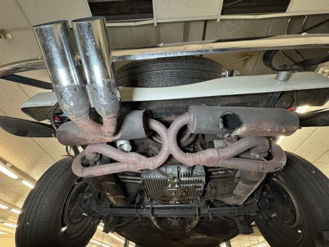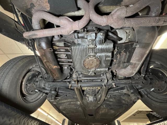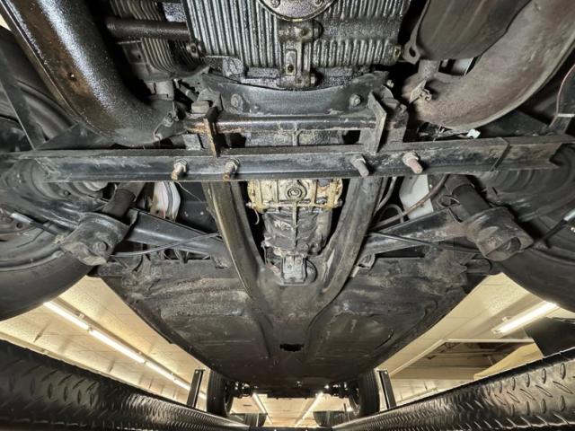 Generally clean with minimal surface rust and clear knuckles, we do note some residual oil on the right side of the engine, around the exhaust manifold and surrounding area. Belly pans cover most of the underside and lack any invasive rust but do show some seam separation on the passenger side. The dual exhaust runs into stock style mufflers and the tailpipes have broken off one side, so the twin tips we see would actually be four if not for the missing side. Drum brakes are employed at all four wheels and suspension consists of transverse torsion bars up front and torsion bars with semi trailing arms in back.