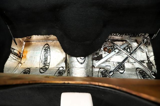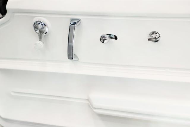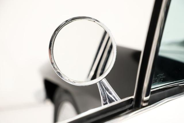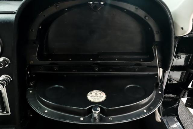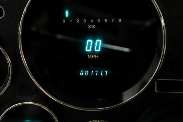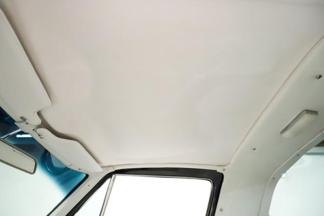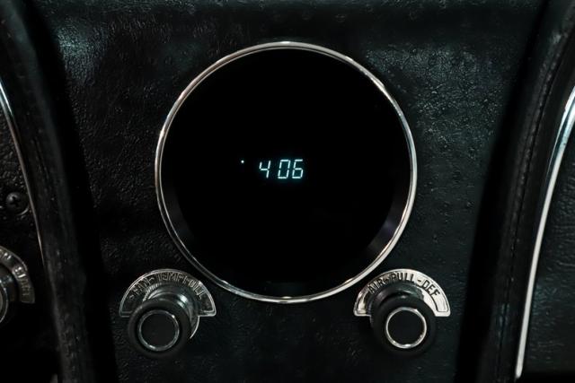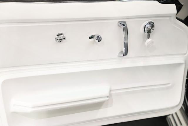 INTERIOR: The bright white interior is stunning against the black paint! It has real fresh looking carpet front to back and underneath that is sound deadener/insulation. The dash pads are covered in ostrich leather, the instrument panel is very clean and all the gauges including the clock are upgraded with digital. The retro stereo fits in the factory hole and the air conditioning controls and vents were neatly installed. It was upgraded with a tilt column with a deluxe wheel. The center console looks really nice and it has a factory type 4-speed shifter and power window switches. The interior moldings, headliner, visors and door panels are all a crisp bright white. The seats are reupholstered in genuine white leather and the seat belts are even white!