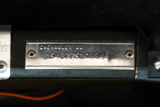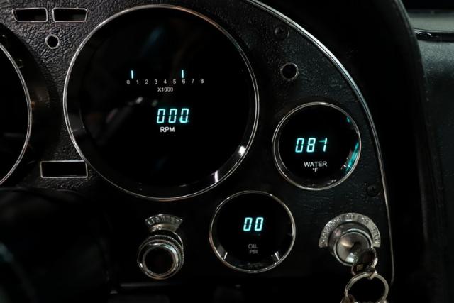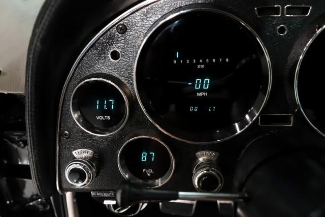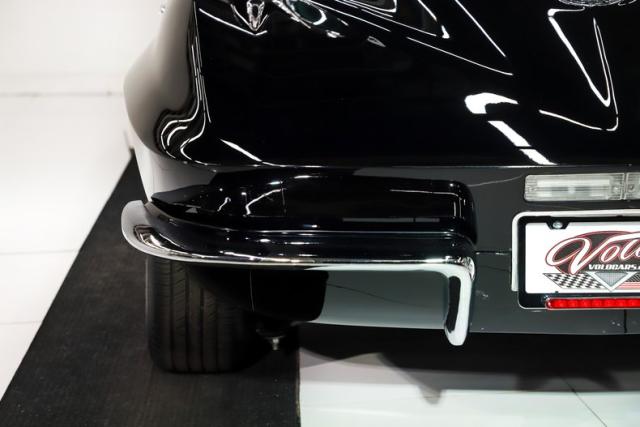 EXTERIOR: Factory Tuxedo Black, code 900 on the trim tag. It may have been born black, but it didn\'t look this slick in 1967! The body is absolutely laser straight and fits right. The headlights open properly, the doors click shut. I did not see any cracks, damage or body work. It is polished like glass, even the white stinger stripe is smooth to the touch. The antenna was removed and the taillights were flush mounted for a clean look. The LED taillights are behind smoked lenses and there are also brake lights/turn signals on the license plate frame. The bumpers are good, emblems, mirrors and handles are excellent. The side exhaust not only looks great but sounds great too! It\'s rolling on the best looking C2 wheels, all silver with spinners. Each one is wearing a Hankook tire.