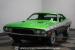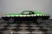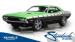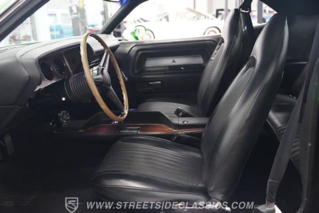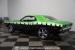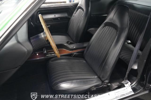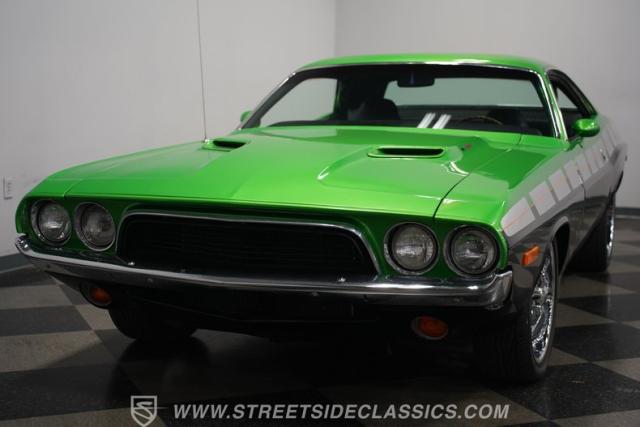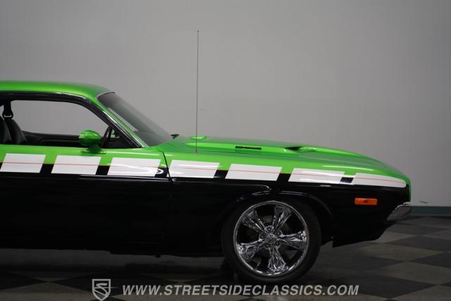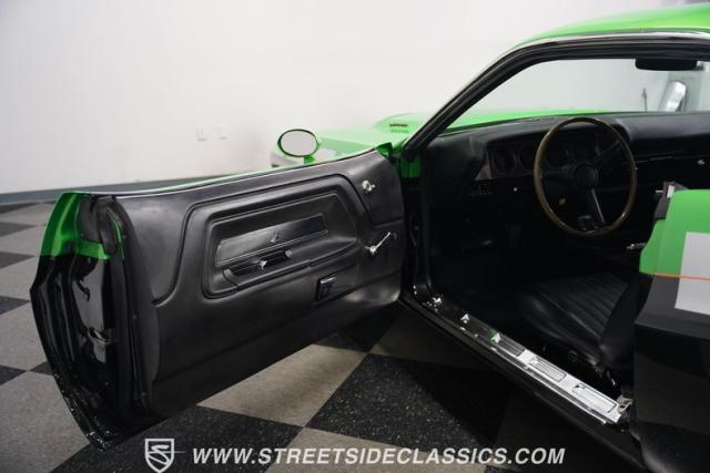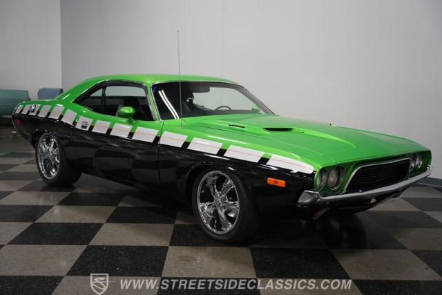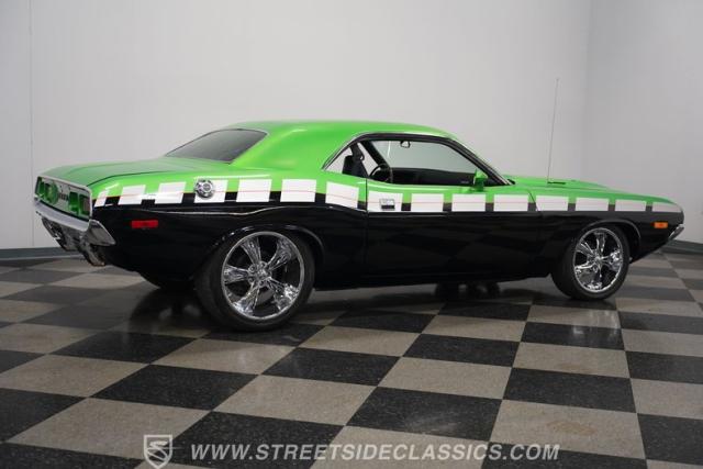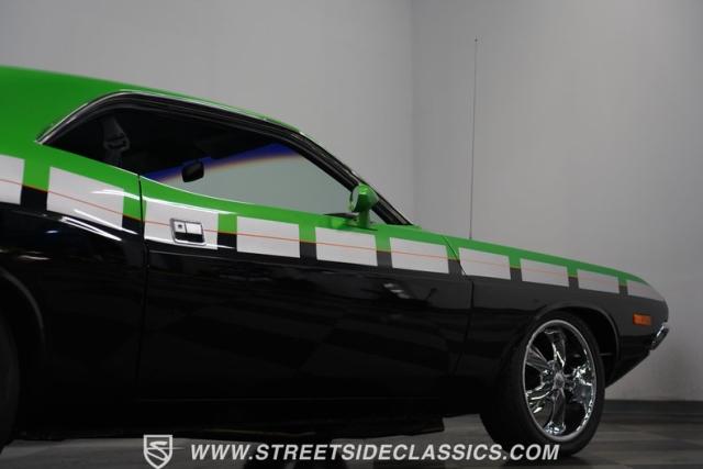 Taking street domination to a new level, this 1974 Dodge Challenger wears an authoritative two-tone paint scheme featuring a deep green primary color accented by menacing black sections and silver racing stripes. The aggressive visuals continue with a muscular stance achieved through staggered Foose wheels - 18-inch diameter up front and massive 20-inch wheels in the rear, fitted with performance-rated 225/45ZR18 front and 275/40ZR20 rear tires. The refined body lines flow seamlessly from the iconic front grille to the signature rear taillights, while gleaming chrome bumpers punctuate both ends. This E-body\'s visual impact amplifies its street presence through expert craftsmanship and attention to detail.