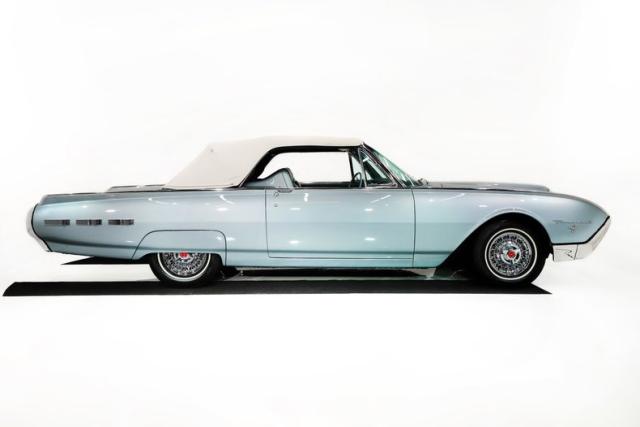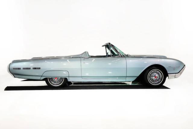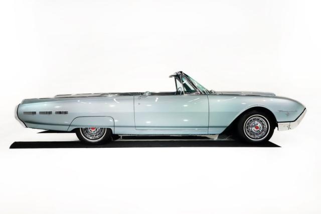 EXTERIOR: What a sleek, aerodynamic shape that looks like a bullet in motion and in back its iconic jet inspired taillights resemble thrusters. This particular example stands out with a laser straight body and excellent panel fitment throughout. It is finished in its very classy original color of Silver Mink, a sophisticated metallic shade that perfectly complements the Thunderbird\'s sculpted lines. The metallic finish is laid out evenly, and the clear coat has a very smooth, glossy shine. As part of the desirable Roadster package, it features the signature tonneau cover that transforms the car into a sporty two seater. The cover can be easily removed by one person in less than a minute, instantly revealing the full rear seat when desired. The stainless trim appears to have been professionally straightened and polished, while the chrome has been beautifully replated. This car truly sparkles from every angle. It rides on gorgeous Kelsey-Hayes wire wheels with spinner caps, wrapped in Hankook radial tires for a smooth and comfortable ride. The white convertible top is in excellent condition, retracting neatly into the trunk and operating properly, adding even more intrigue to this stunning roadster.