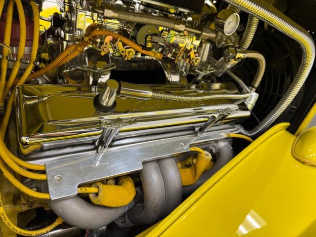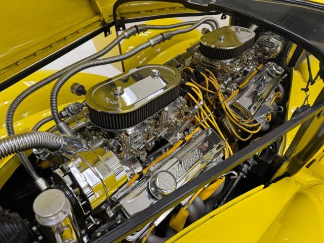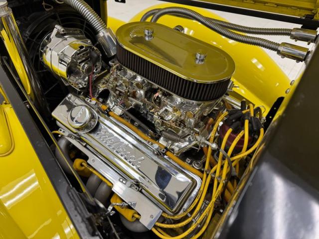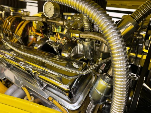 The engine is exposed due to lack of engine covers, but pivoting the hood helps reveal its full shine, a chromed 350ci V8 that\'s reflected perfectly in the mirrored fire wall, and it\'s topped by dual Edelbrock 4-barrel carburetors, chrome air filter cover, chrome valve covers. Behind it, a 700R4 4-speed automatic transmission sending power to a 10 bolt axle.