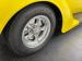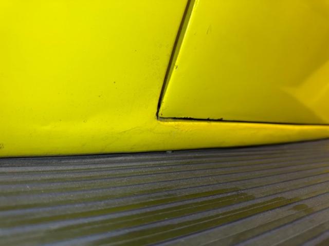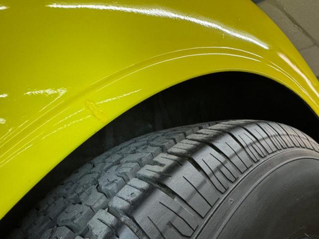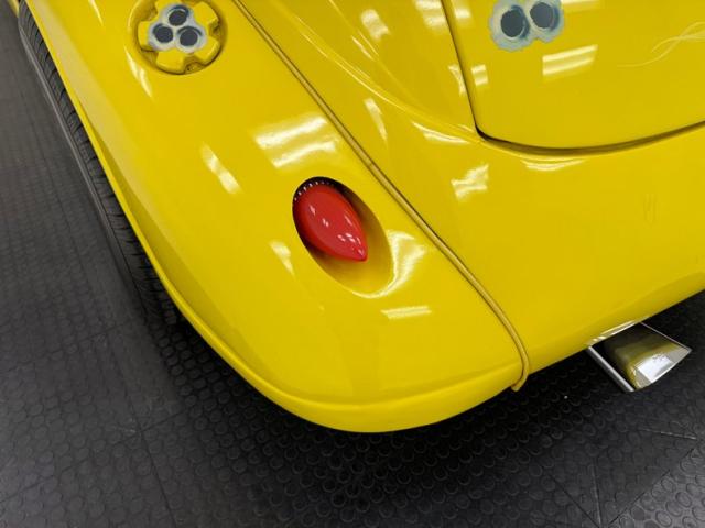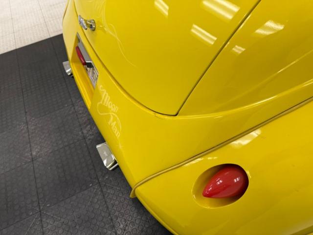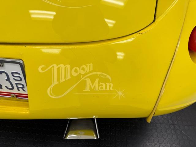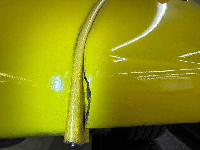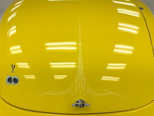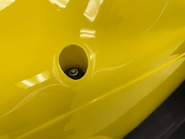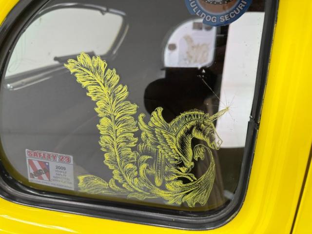 Our owner didn\'t change the color when he bought it; it was one of those things that attracted him to it. It\'s yellow, as you can see and if you look close, you\'ll note some light pinstripe flourishes on the front fenders and a yellow etch-style painting of a unicorn on the quarter windows. The frenched tail lights flanking the big business end of the car are a great touch and there\'s also some ghost pinstriping and graphics back here. We\'ve got 14-inch wheels in front and 15\'s in back and they\'re polished American Racing Torque Thrust wheels carrying staggered height and width tires that create a slightly raked profile while a wide, rubber topped running board runs between them. Imperfections include some scratches, blistering down low, touched up chips, a crack in the rear fender near the seam, and a few spots of uneven filler.