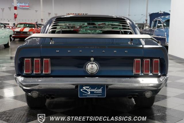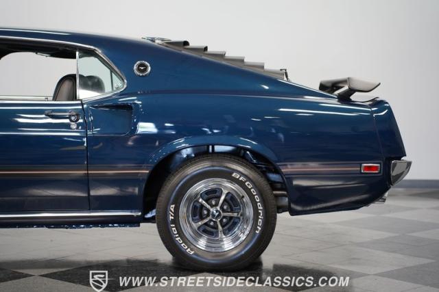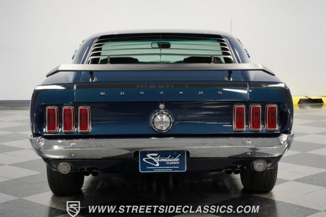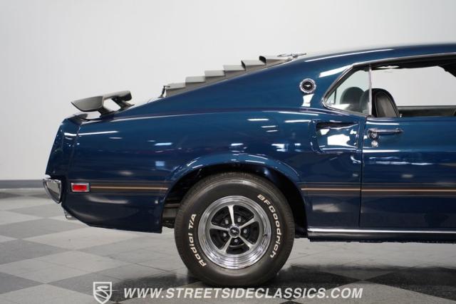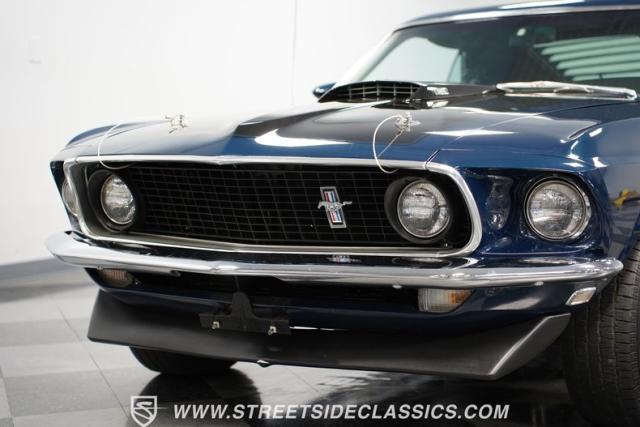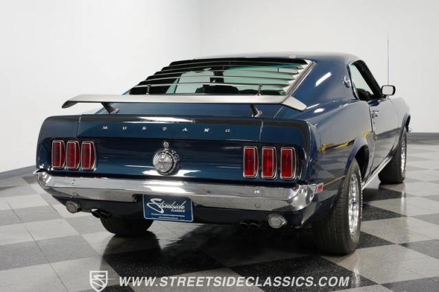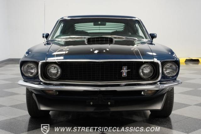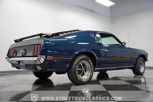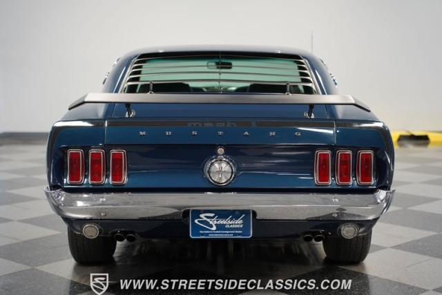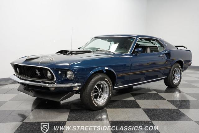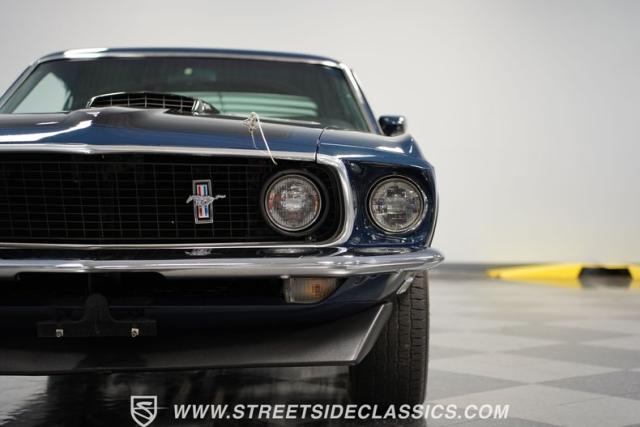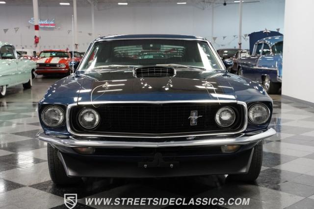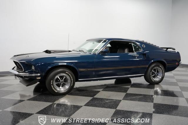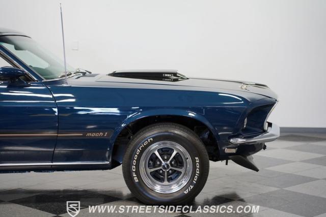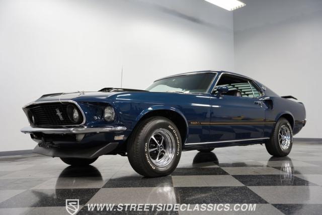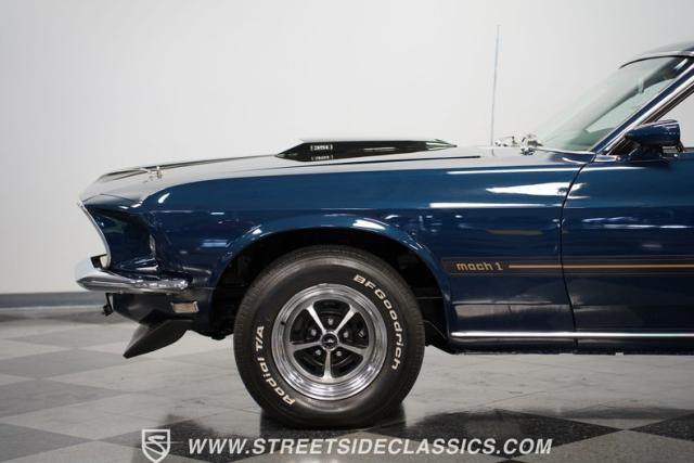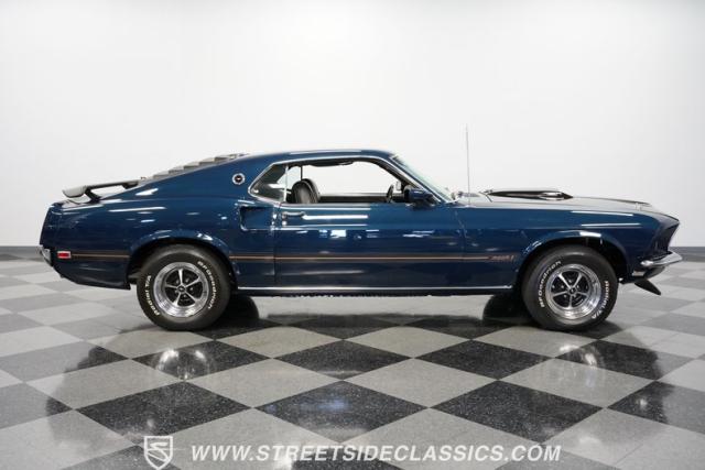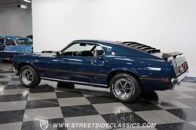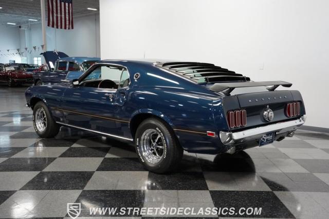 This 1969 Ford Mustang Mach 1 sports a deep, dark blue exterior that radiates classic muscle car attitude. Black decal stripes slice across the glossy paintwork, creating a bold contrast that emphasizes the fastback\'s sleek profile. The car sits on 14-inch Magnum wheels wrapped in 215/70R14 tires, giving it a pure American performance stance. Rear window louvers add an aggressive touch, while polished chrome bumpers and trim provide brilliant accents against the rich blue backdrop.