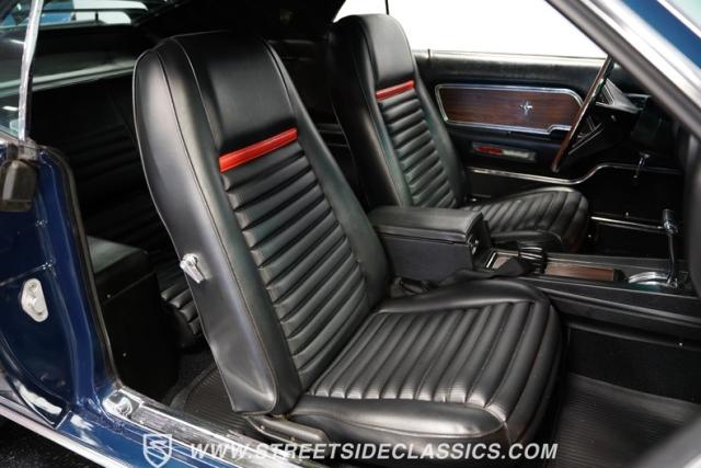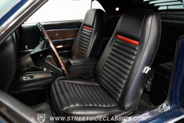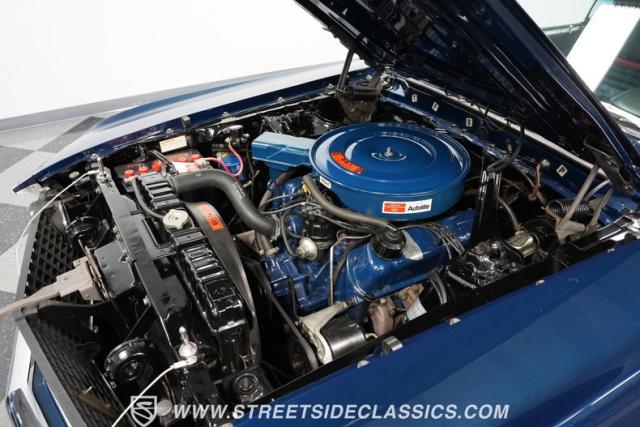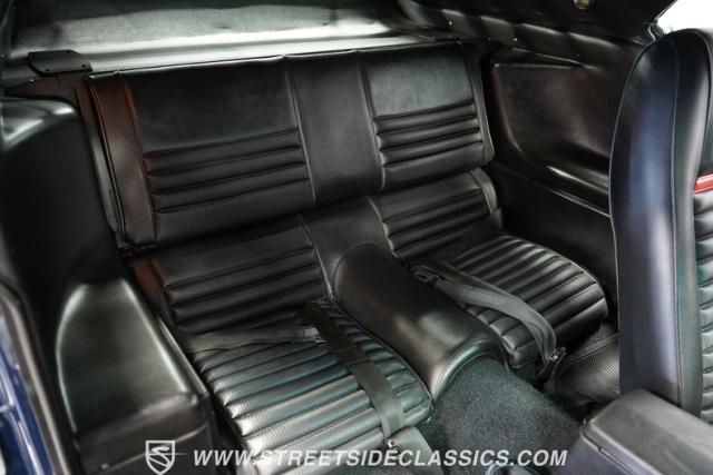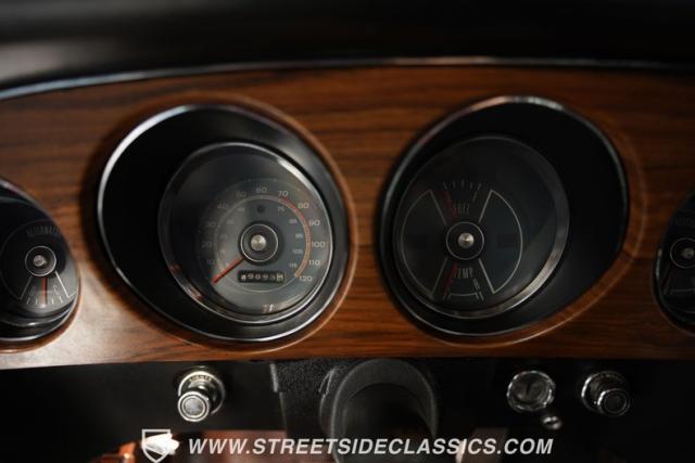 Open the door to reveal a black vinyl interior that epitomizes the late \'60s muscle car style. The comfortable bucket seats offer excellent support for enthusiastic driving. A floor-mounted shifter rises from the center console, placing gear selection right where you want it. The dash features a clean, driver-oriented layout with clear gauges. A distinctive rim-blow steering wheel adds a unique \'60s touch, while the Philco AM radio and factory climate controls maintain period-correct ambiance.