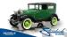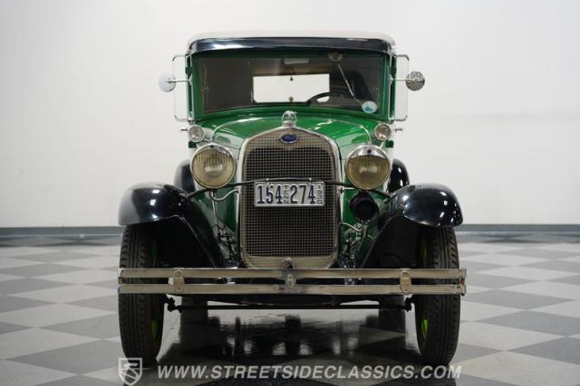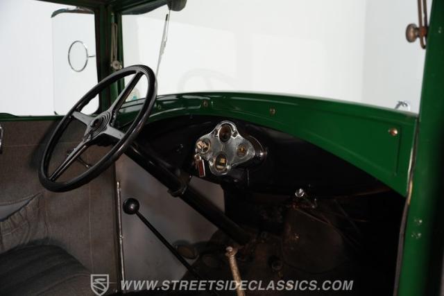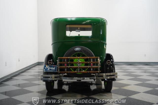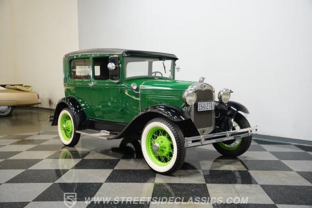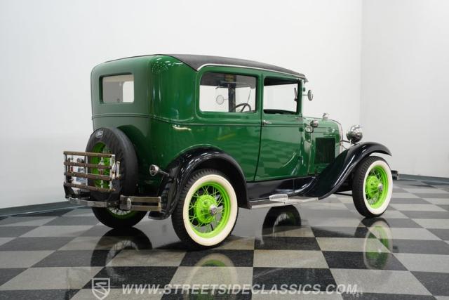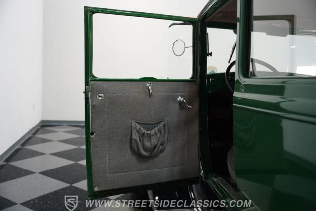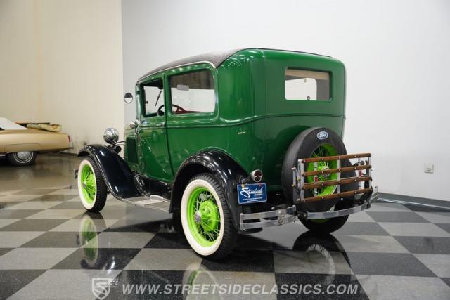 This 1930 Ford Model A Tudor Sedan is a genuine piece of automotive heritage. Its green and black exterior gleams with a hint of nostalgia, showcasing the iconic Model A silhouette that defined an era. Rolling on light green-colored 19-inch wheels wrapped in 4.75/5.00-19 wide whitewall tires, this classic maintains its original stance and road presence. The accessory grill guard, Quail radiator cap, headlight visors and trunk rack add to the appeal of this handsome Model A.