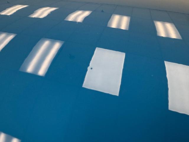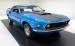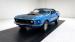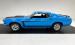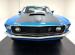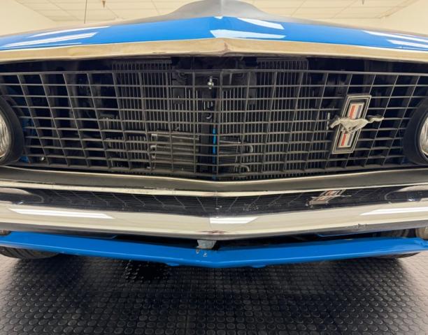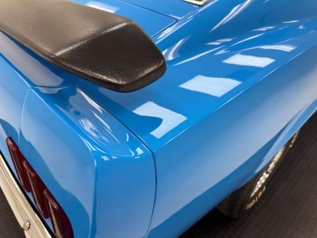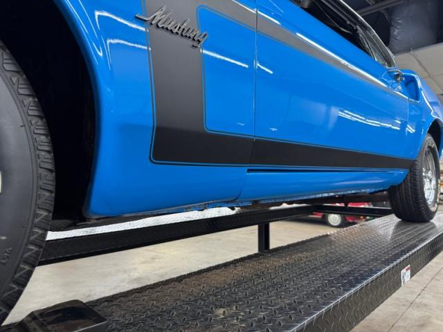 Black vinyl door cards conclude with Grabber Blue base panels and both sides present cleanly, leading to black vinyl bucket seats that are in rough shape, especially the driver\'s, and both seats wear aftermarket covers. Our rear 2+2 is in better shape but still has a few small tears. Up front, an aftermarket steering wheel fronts an instrument cluster that shows some age and a simulated woodgrain glove box with embedded clock and Mach I tag. The standard Ford shifter is on the transmission tunnel over black loop carpet that\'s in decent shape, all under a headliner and visors that could use a freshening, but present intact. Barren conditions are found in the unfinished trunk with only wisps of surface rust.