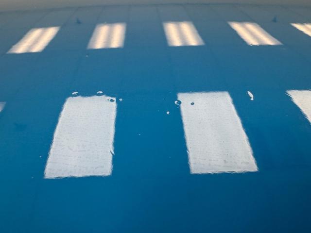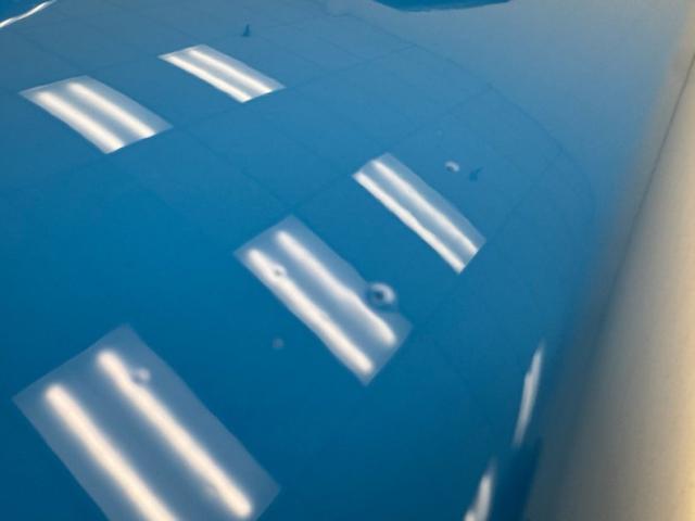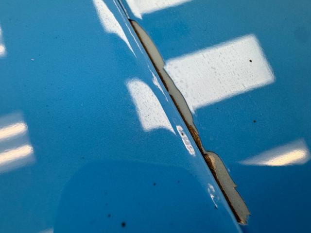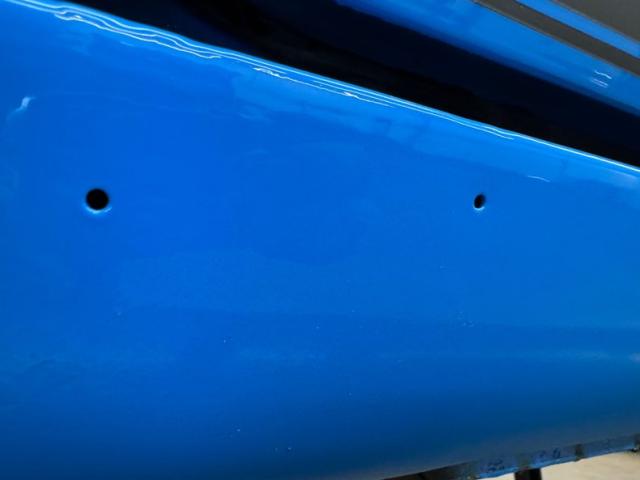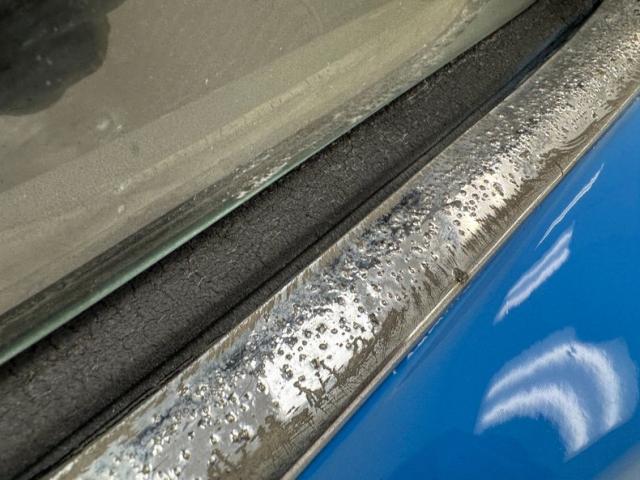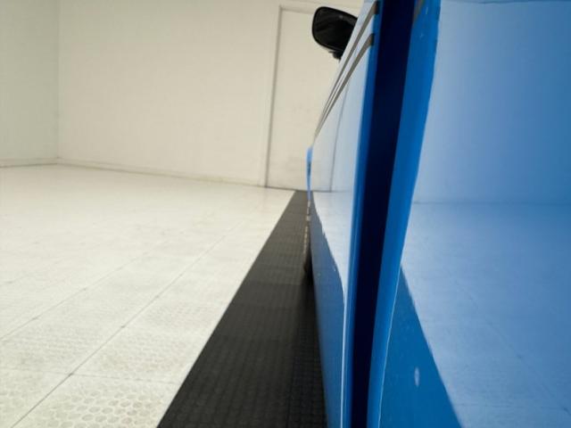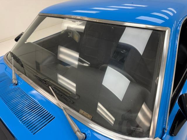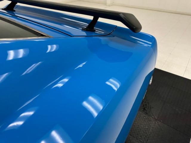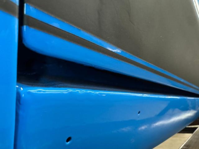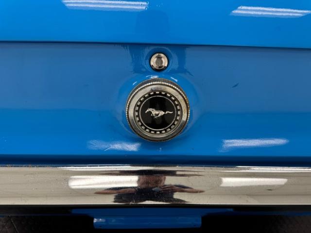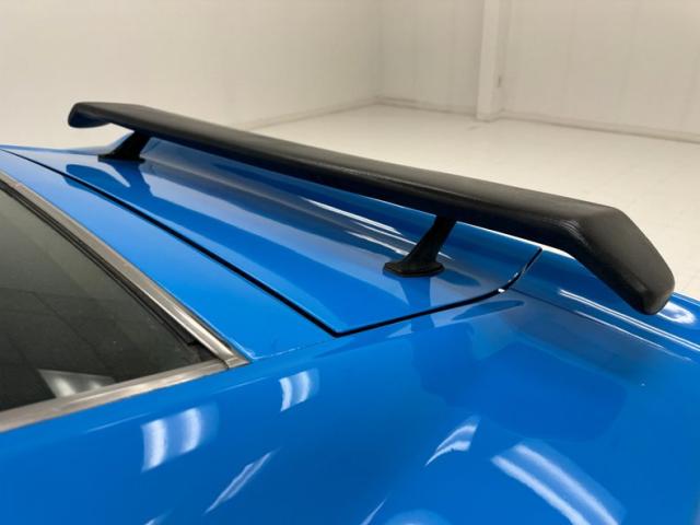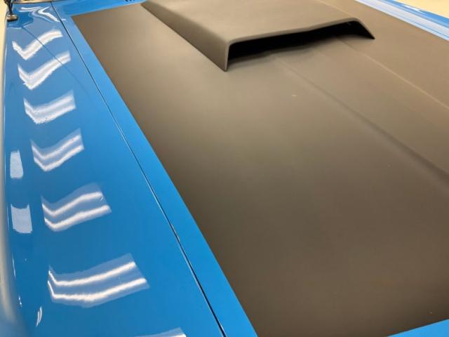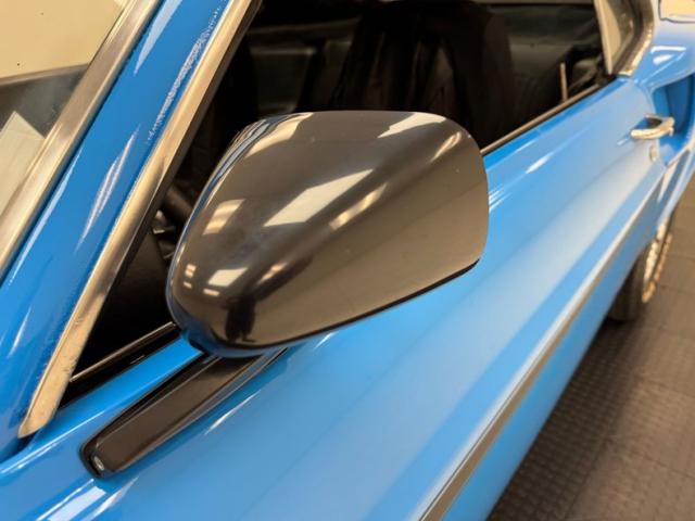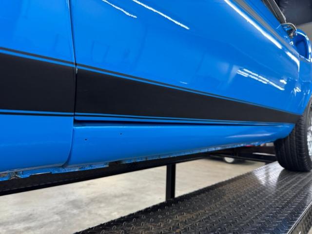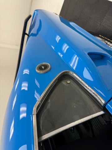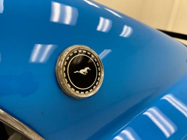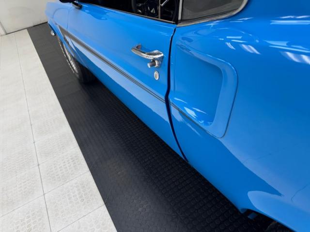 In a change that offered Ford vibrancy, this one\'s done up in two stage Grabber Blue with a black, Boss-style C-shaped side stripe. That stripe is complemented by the matte black hood and its wide hood scoop, black sport mirrors, and the rear wing. While in back, we note the tail light panel kept monochromatically in Grabber Blue while up front, aggressive inboard lights occupy the ends of the grille with headlights set back in typical Mustang configuration. 14-inch Cragar SS are at each corner with equally sized tires at each end. Imperfections include some chipping paint, pitted metal trim including window trim and door handles, dimples in the paint on rear fender and roof, fitment and gap issues with driver\'s door, drilled holes in the rocker panel, and occasional inclusion in the paint.