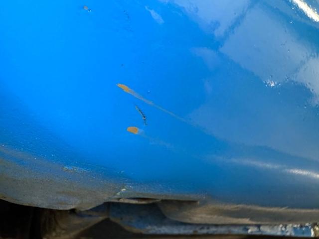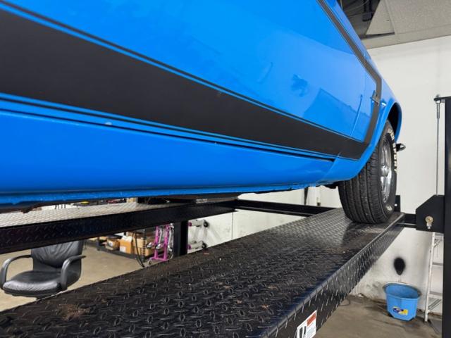 Driver quality conditions prevail underneath with typical surface rust and one body brace panel that has flaking rust through that\'s also noted on the inner rocker panel. A single exhaust flows through a glasspack style muffler and exists in front of the left, rear wheel. Power brakes include front disc and rear drum and suspension consists of coil springs in front and leaf springs in back.