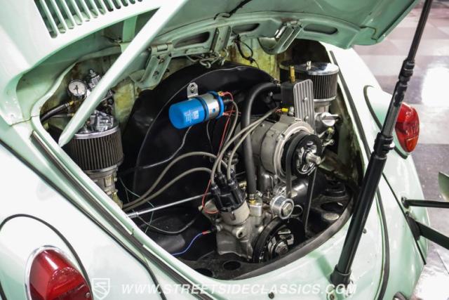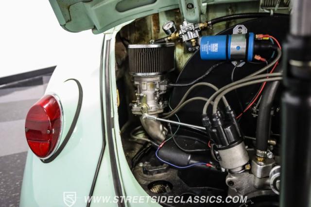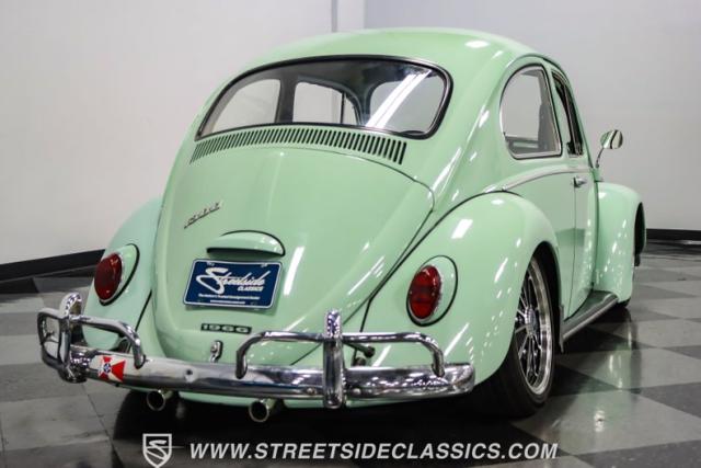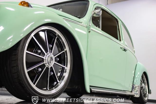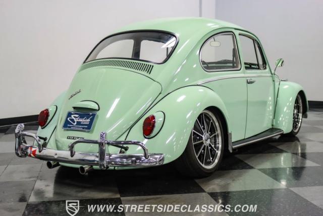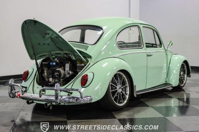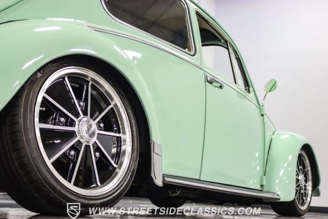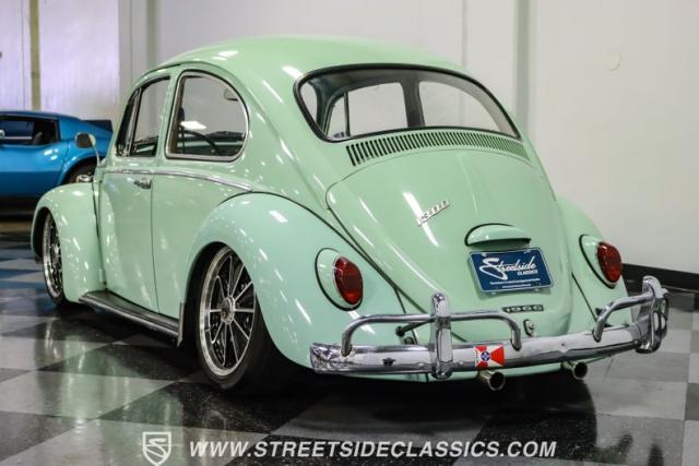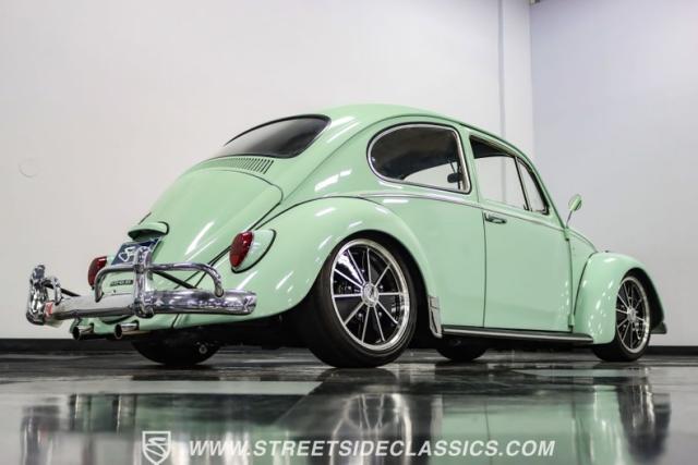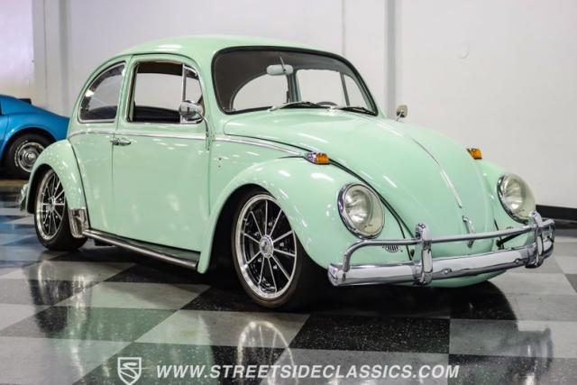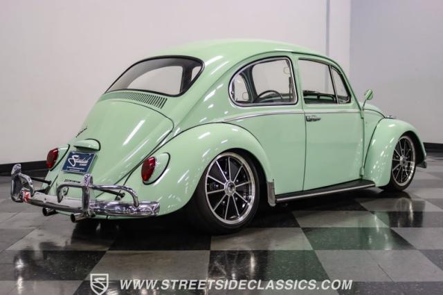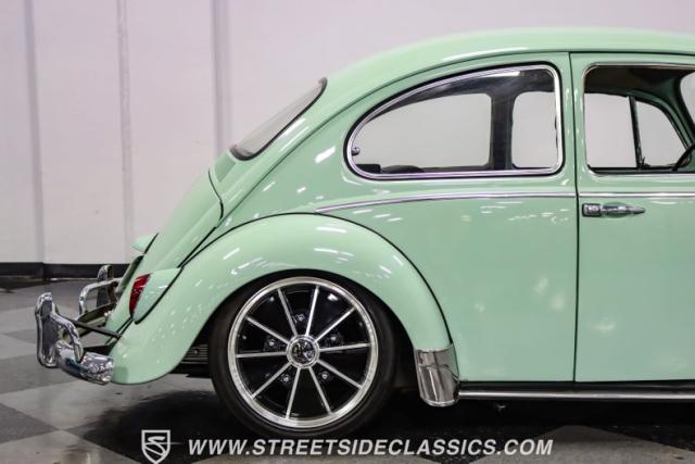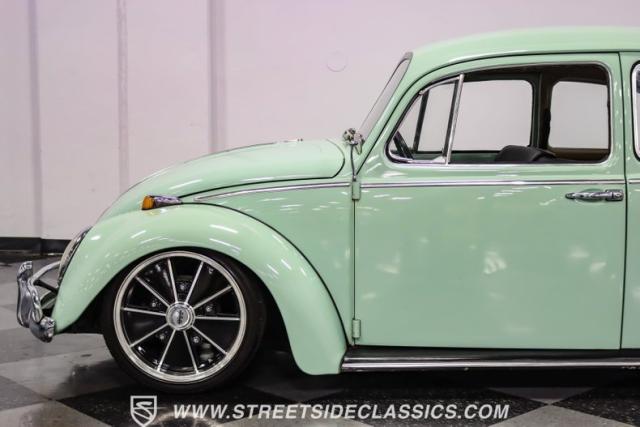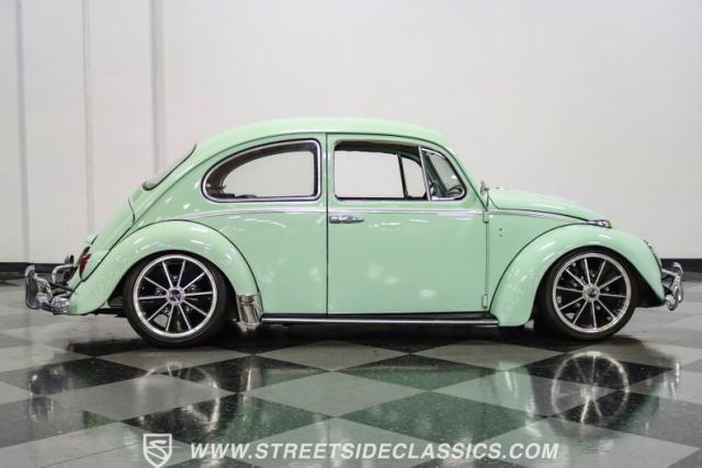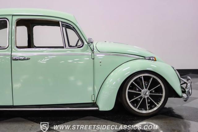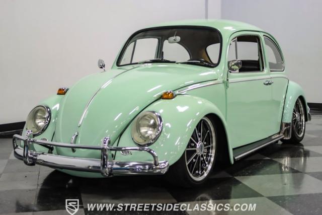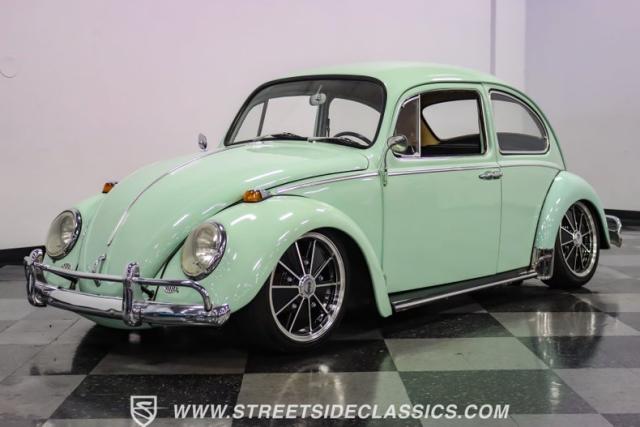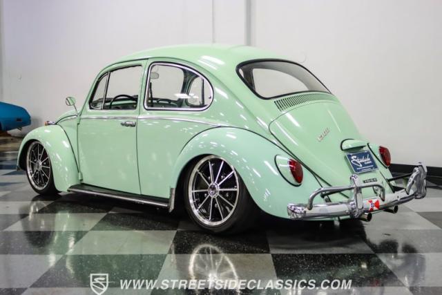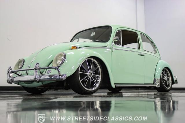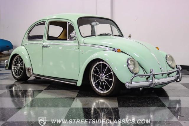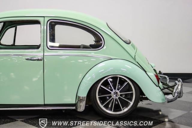 This 1966 Volkswagen Beetle rocks a custom Seafoam Green paint job that\'ll make you do a double take. It\'s not your average Bug - this one\'s got attitude. Slammed to the ground with air shocks in the back, it\'s got a mean stance that screams performance. The classic chrome bumpers with overriders and front fender vents give it that authentic \'60s flavor, while 17\" BRM EMPI wheels wrapped in 205/40ZR17 front and 205/45ZR17 rear tires bring it into the 21st century. This Beetle\'s got the perfect blend of old-school cool and modern muscle.