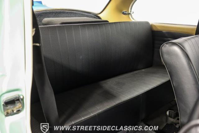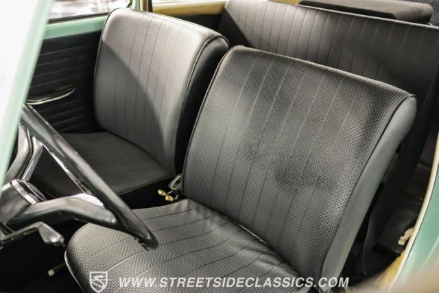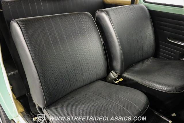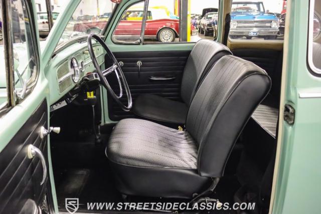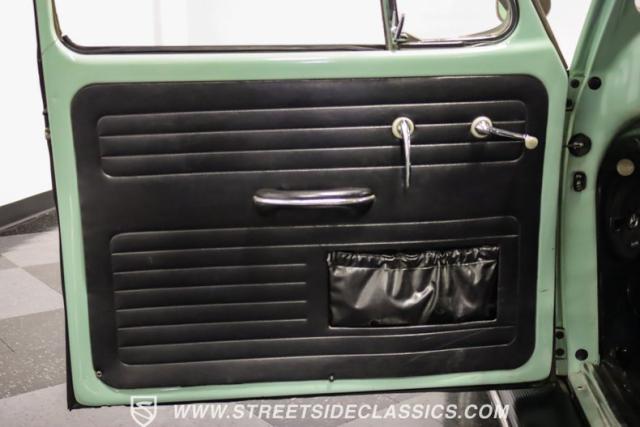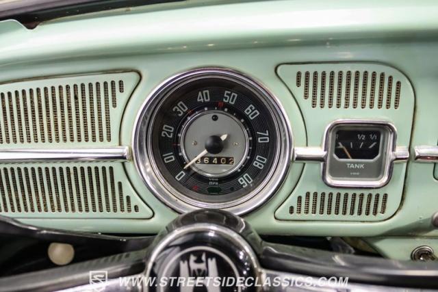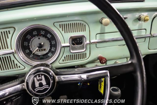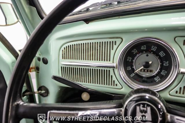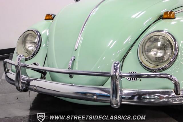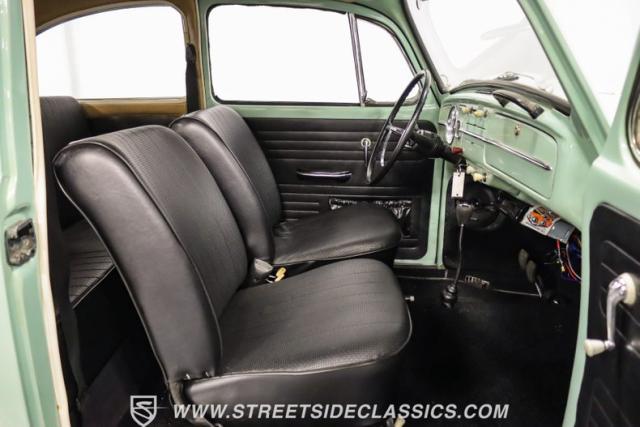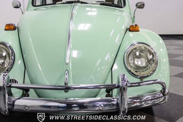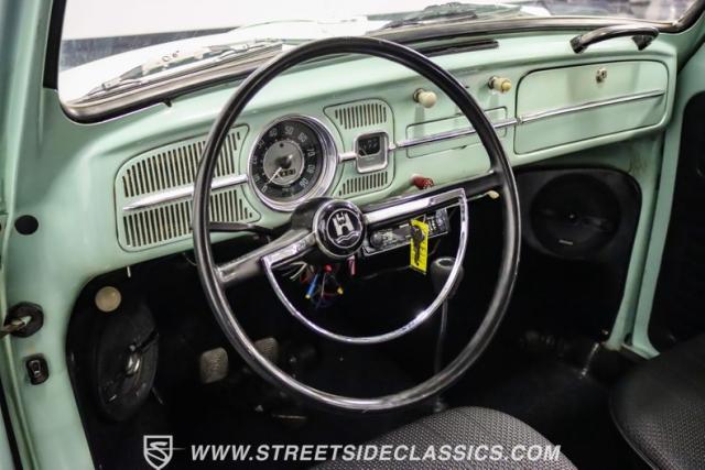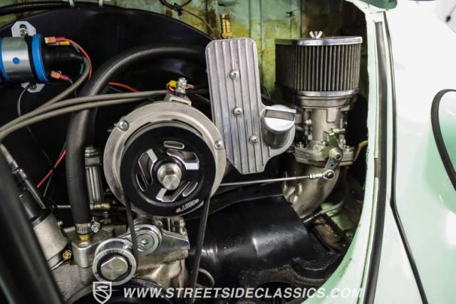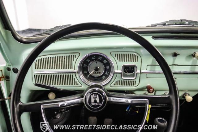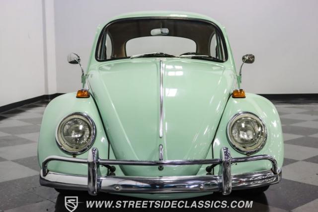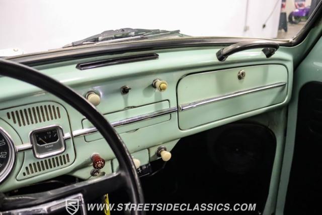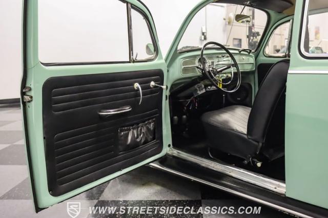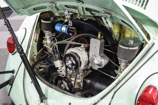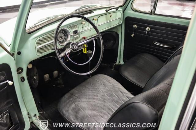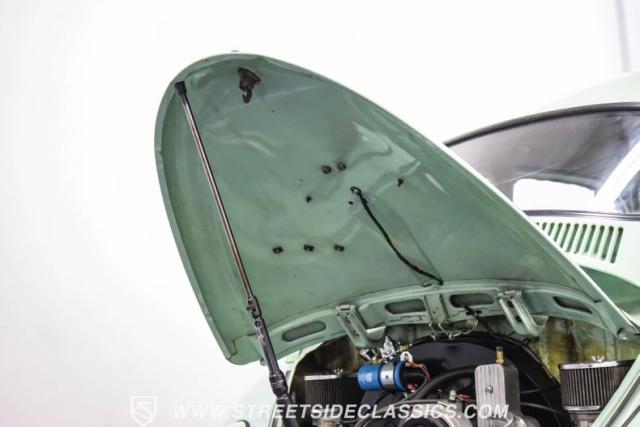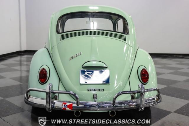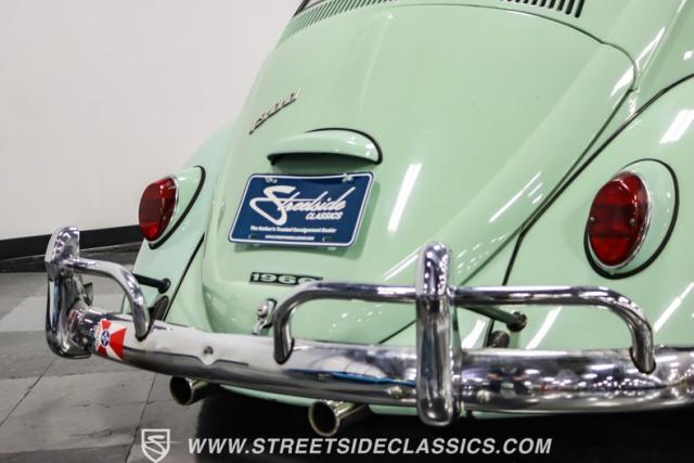 This 1966 Volkswagen Beetle rocks a custom Seafoam Green paint job that\'ll make you do a double take. It\'s not your average Bug - this one\'s got attitude. Slammed to the ground with air shocks in the back, it\'s got a mean stance that screams performance. The classic chrome bumpers with overriders and front fender vents give it that authentic \'60s flavor, while 17\" BRM EMPI wheels wrapped in 205/40ZR17 front and 205/45ZR17 rear tires bring it into the 21st century. This Beetle\'s got the perfect blend of old-school cool and modern muscle.