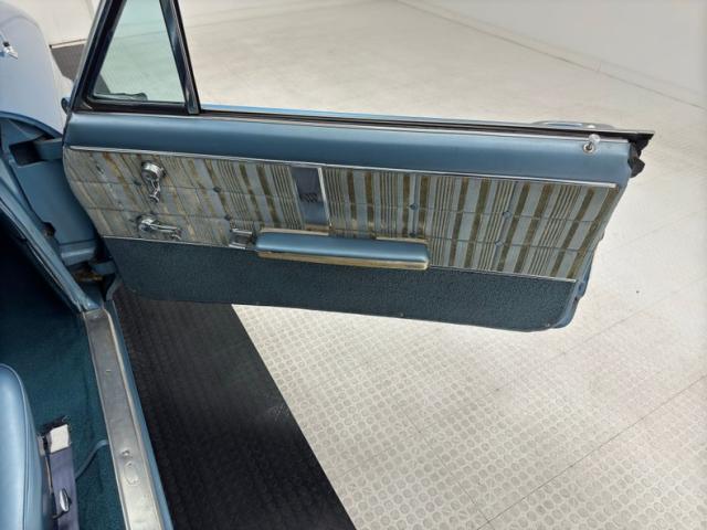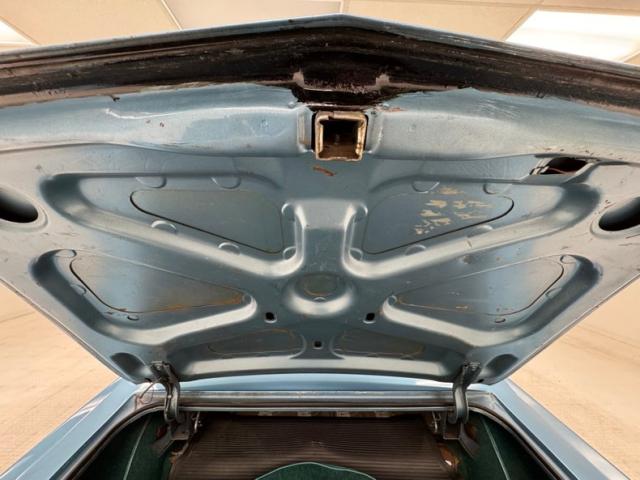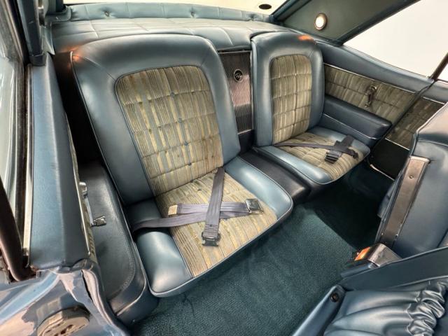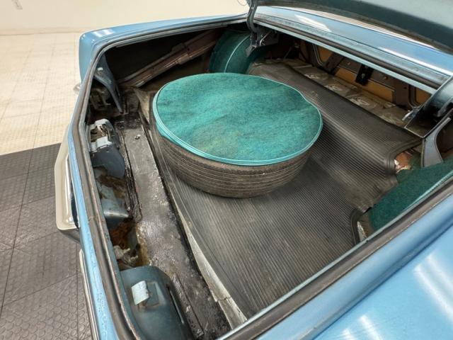 Striped cloth on the door panels has seen better days and might benefit from some restoration, while the panel is intact including the carpeted kick panels. The striped material fares better on the bucket seats, surrounded by blue vinyl that wears a tear on the driver\'s seat, but all looks well on the passenger seat and the 2+2 seating in back. A biscuit tufted pad covers the package tray behind the seats for an added detail we rarely see. Patina lives on the blue steering wheel with plenty of hairline cracks and faded paint on the horn bar. Up front, the original instrument panel is backed by ribbed metal while the center stack is basking in black, cleanly housing an AM/FM radio and the vent controls. We follow the textured black to the center console, home to the chrome shifter in a metallic plate, all over blue loop carpet in good condition and under a blue headliner where one seam is torn, and others are stretched. The trunk is driver quality with a rubber mat that fits nicely and a spare tire.