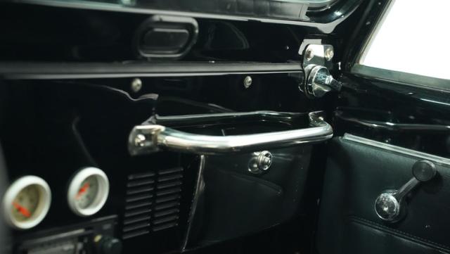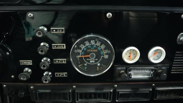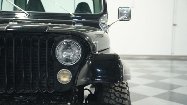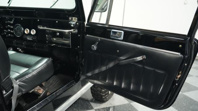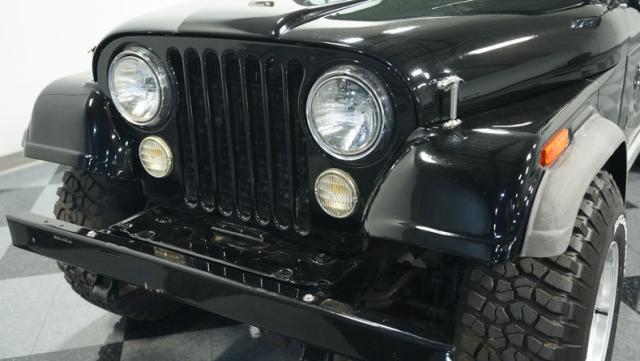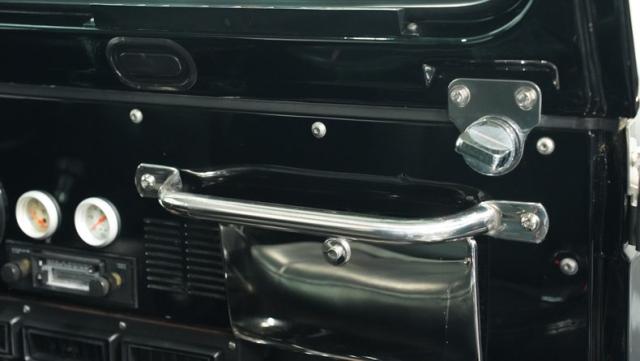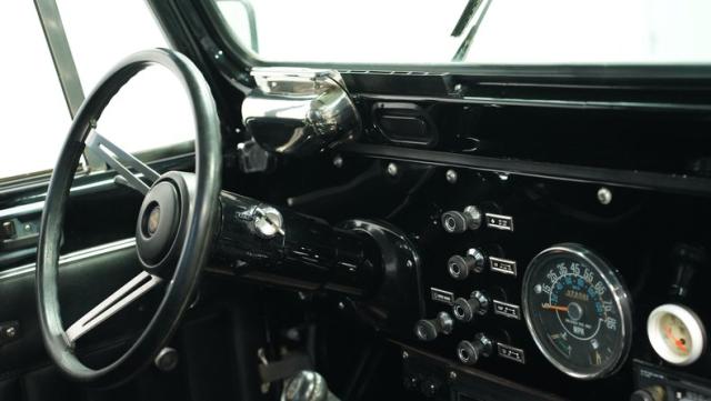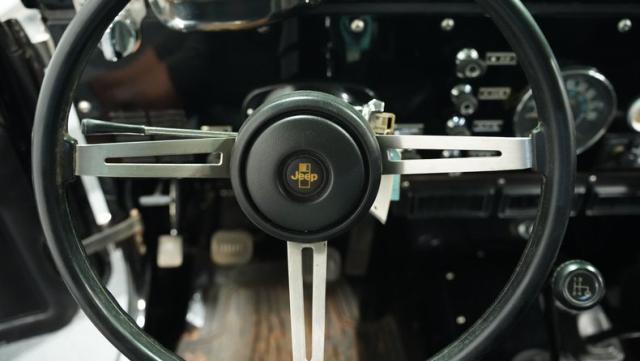 Inside, we find a traditional CJ-7 interior with two vinyl bucket seats and a utilitarian center-mounted gauge cluster along the dashboard. The big speedometer is flanked by three pull- and two twist-knobs on one side and two modern white-faced gauges displaying volts and oil pressure on the other. And while it has been known by many names, the passenger grab-bar has been upgraded to a stainless-steel piece.