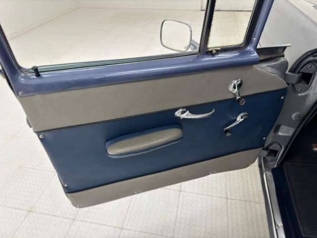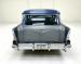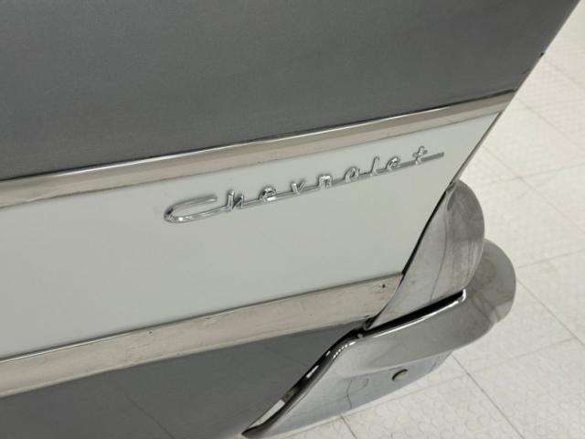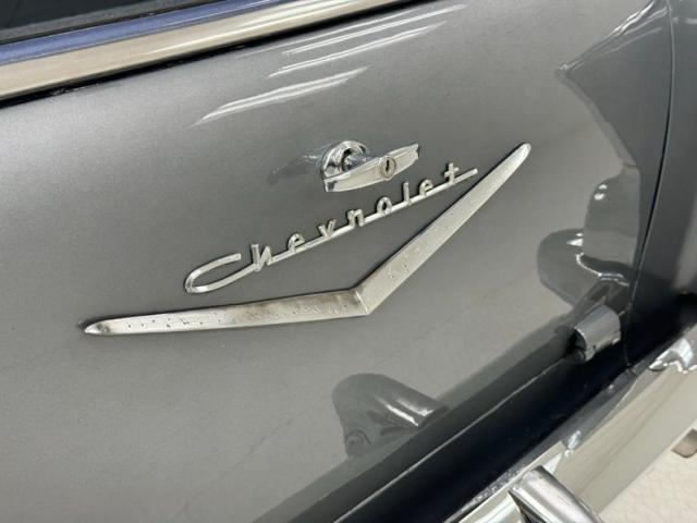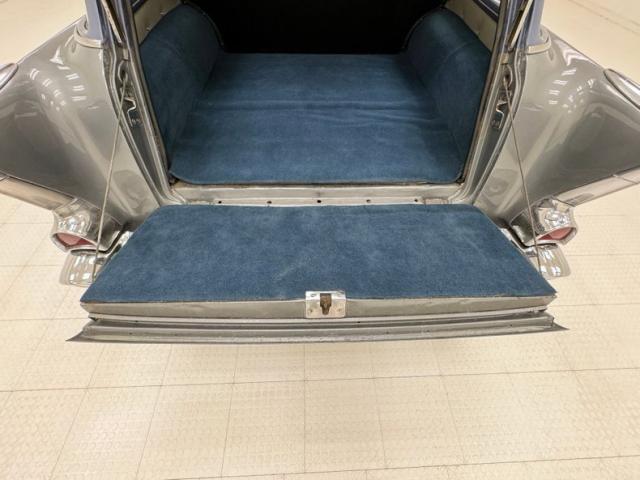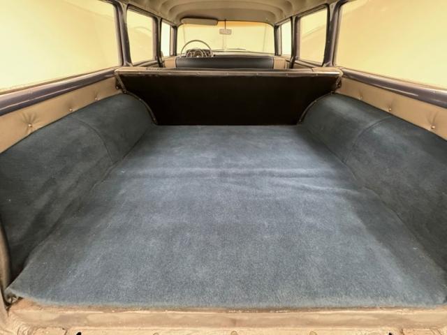 A blue band of vinyl is sandwiched between two gray/tan panels on each inner door and has chrome hardware, a simple design all in good shape. The front bench maintains that pattern in a vertical display and blue piping augments the design which is mirrored in the back seats, and everything looks to be in great condition. A bit of patina on the awesome Chevrolet steering wheel, with horn ring, all leading to the body color dash dominated by three protruding gauges, backed by indicator lights, and joined by vent levers on the lower dash. In the center of the stylized mesh dash panel is a Motorola AM radio next to a gold BelAir emblem in gold. The flat dash continues on its way toward the door where it turns at the end creating a rounded edge. The floor is covered with a high pile blue carpet not unlike what you\'d find in a home and protected by Chevrolet rubber mats, while the vinyl walls of the footwell show some looseness. The long headliner is also loose in a few places but otherwise in very good condition and fully intact. A sea of blue carpet covers the cargo area under a nice detail of button backed bands of gray/tan vinyl.