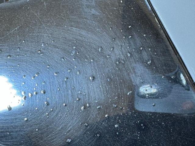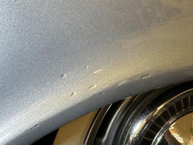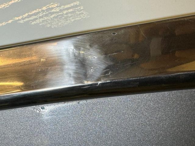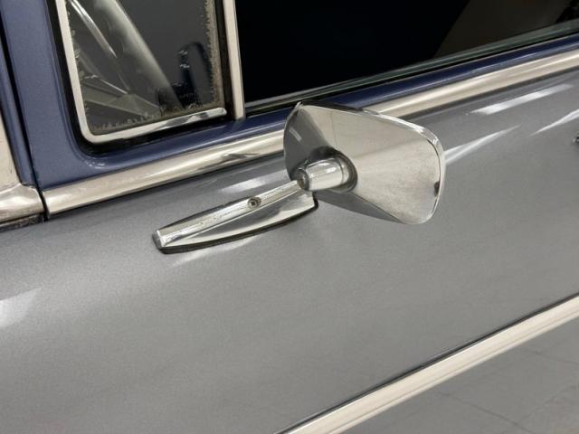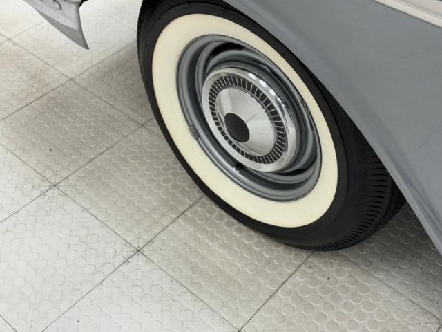 Charcoal Gray covers the body of the car and is contrasted by the Medium Blue Metallic on the roof and pillars. White becomes the third dominant color as it occupies the fender wedge which crosses the door seam and on the Coker white walls which, by the way, have a mid 2021 date code. While we\'re talking wheels, the gray painted wheels wear proper hubcaps and contribute to an original, period look. No fat tires or mag wheels here, just a good, basic stance on stock looking shoes. The chrome and polished metal on the car combine some excellent pieces that will need nothing with a few that could use some restoration and all of the light lenses are in great shape. Fins wing past the vertical rear deck while at the opposite end, headlight brows protrude forward flanking twin rocket ornaments embedded in the hood, all over a massive front bumper. Overall, the paint and body are great. Imperfections include some uneven paint at a wheel opening and other areas, surface scratches, some flaky rust on the bottom side of the body, bubbling, chips, uneven bodywork in seams and other areas, and dings in the metal trim.