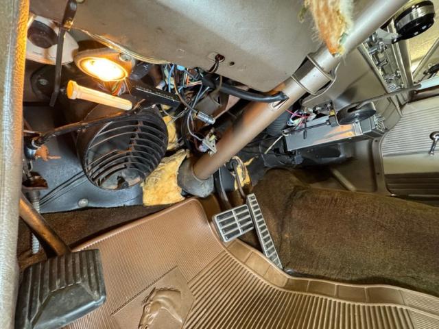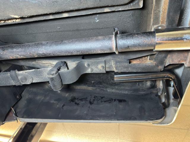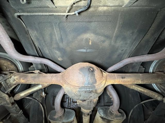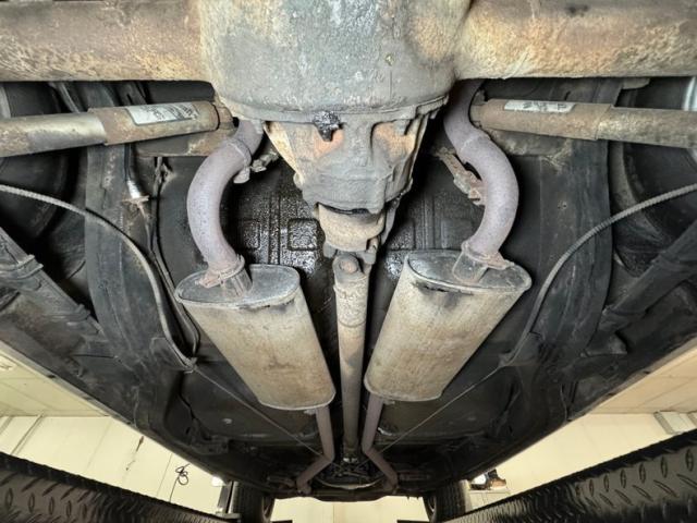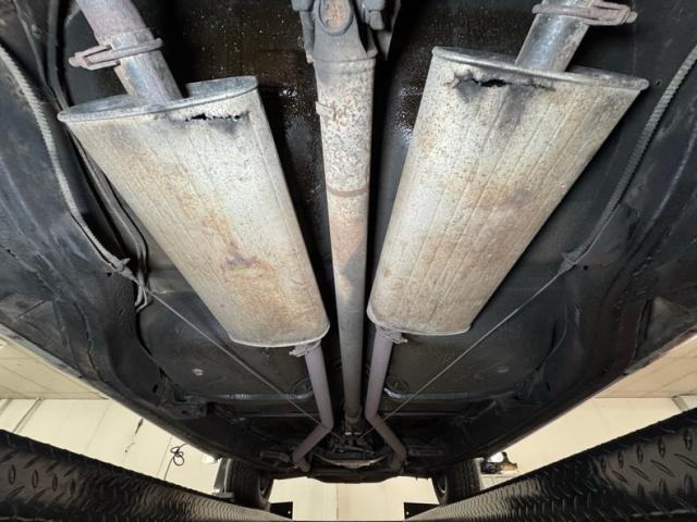 Driver quality underneath with some expected surface rust, some oil sling, and some grime build up on front componentry. The only rust we note is on both of the stock style mufflers which have rusted through, and they are part of the dual exhaust system that terminates with chrome tips emerging out back. Power drum brakes are equipped at each wheel and suspension is standard with coil springs up front and leaf springs in back.