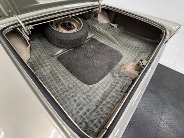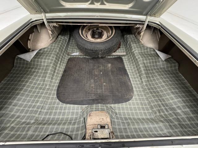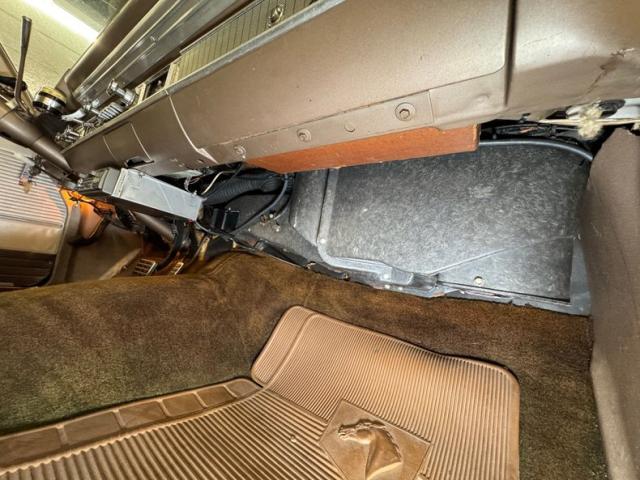 Three shades of brown, including the beige, line the door panels which are enhanced by the aluminum insert housing the armrest. The split bench sports a handsome design with brown velour like cloth bordered with beige vinyl and formalized with accent buttons and polished framing. The rear bench mirrors the materials and design and the sidewalls continue the pattern of the door. Our steering wheel is wrapped in a saddle vinyl cover and leads to the symmetrical dash that puts two round gauges to the sides of the horizontal speedometer. The metallic mid panel takes in knobs, vent levers, an AM radio, an old school liquid compass, and the glove box. There\'s also an AM/FM/Cassette radio mounted under the dash just over the brown carpet that covers the floor nicely along with some Mustang rubber mats. The light headliner up above shows some age with a tear or two, and the trunk is covered with a plaid vinyl mat and is in good condition.