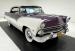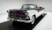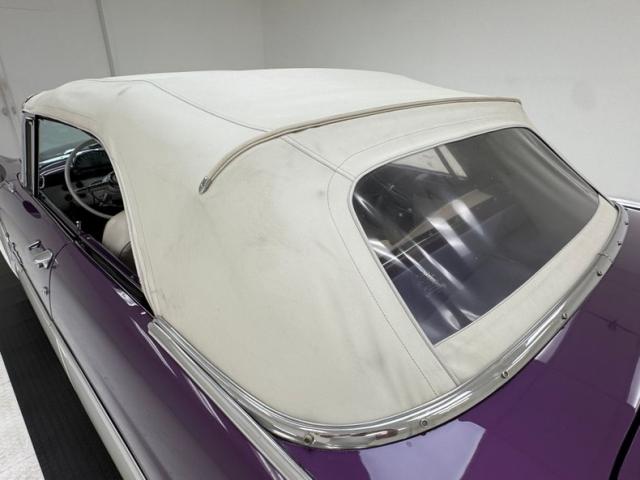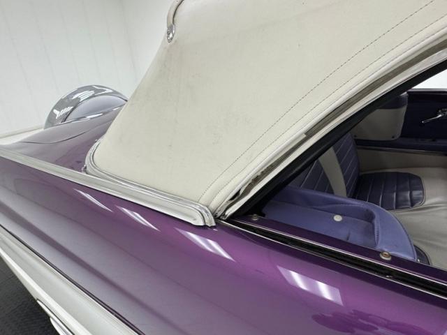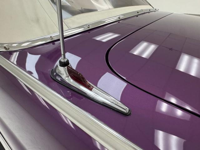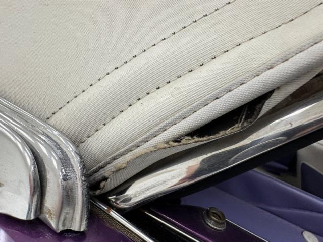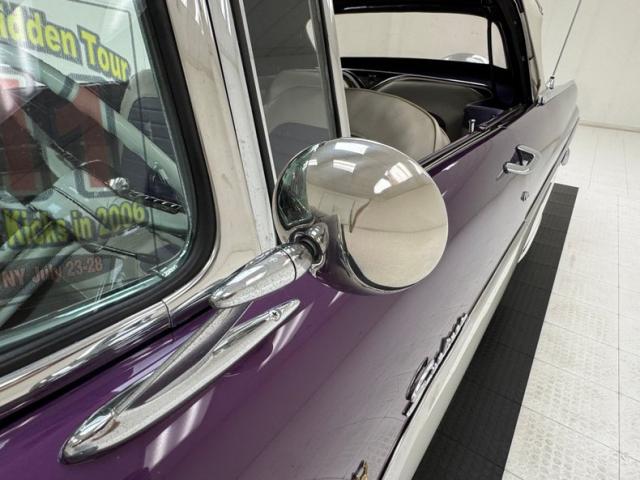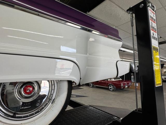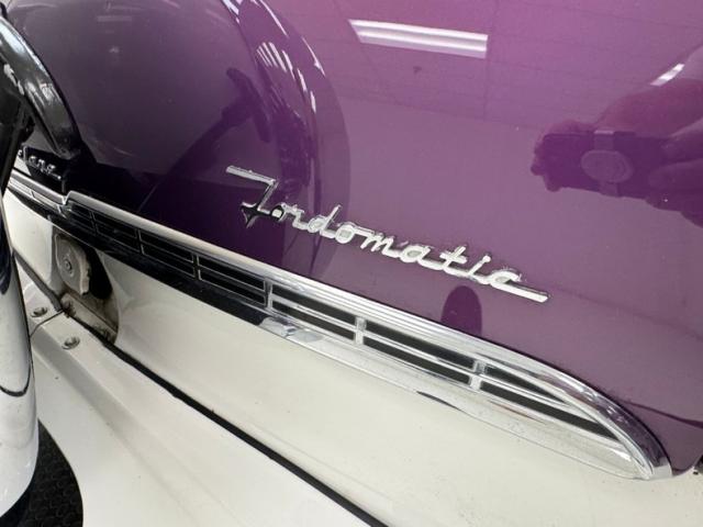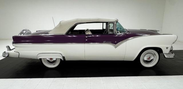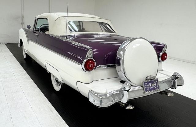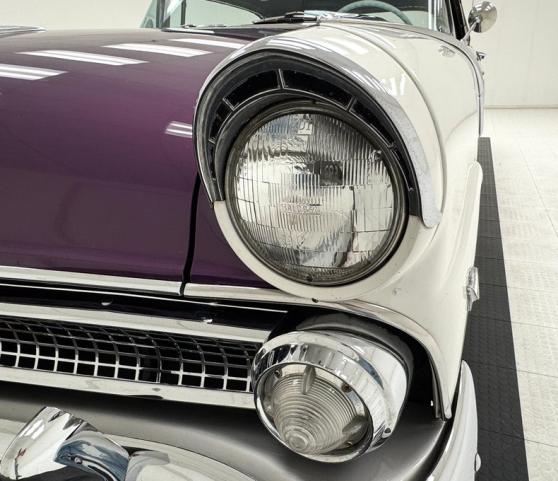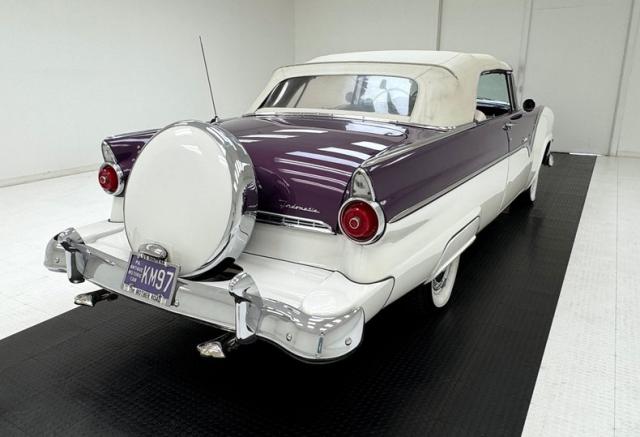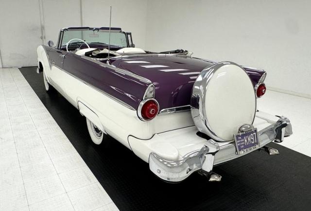 You can call it purple and white, but Ford gave it more creative names with Regency Purple Poly and Snowshoe White, a combination that would be a standout, even in the 1950\'s. It\'s purple over white on this car with the colors being separated by a distinctive trim piece that rides the front fenders before diving down on the body, creating a wide V, then firing back to the edge of the rear fender. This adds visual interest to a shoulder line that is arrow straight while fender skirts add some sleekness to this big car and obscure almost half of the back wheel and its lovely white wall tires, but the wheel openings in front allow us to see the Ford branded wire covers. Its white canvas top is in very good condition, and the plastic window is only slightly hazy. A Continental kit dresses up the back that also features an attractive pair of round tail lights with cone shaped reverse lights above and a grille like ventilation panel, along with decorative exhaust deflectors. Imperfections include some fraying on seam edges of the top, edge paint chips throughout, and some peeling paint on bottom of skirt.