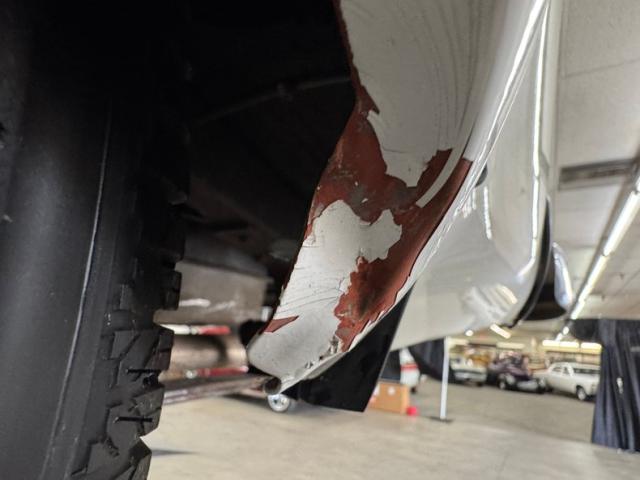 Some typical surface rust and oxidation on an otherwise clean underside that feature dual exhaust with Cherrybomb mufflers, front disc and rear drum brakes, and suspension that consists of coil springs up front and leaf springs in the rear.