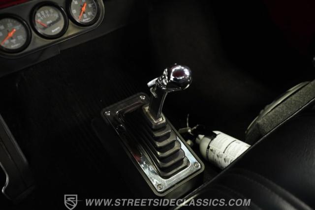 The two-tone, red and black interior makes for a compelling driving environment, with a vinyl bench seat at its center that still has plenty of life left. The adjacent B&M floor-mounted shifter calls for you to grab ahold and start the action, and the undersized steering wheel perched on the tilting column confers an additional aftermarket sensibility. At the center of the dash, an AM/FM stereo with Bluetooth connectivity sits in place of the original radio, sending its sound through both under dash and boxed speakers below the seat to create an outstanding audio experience.
