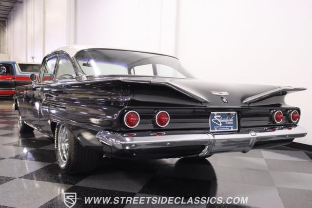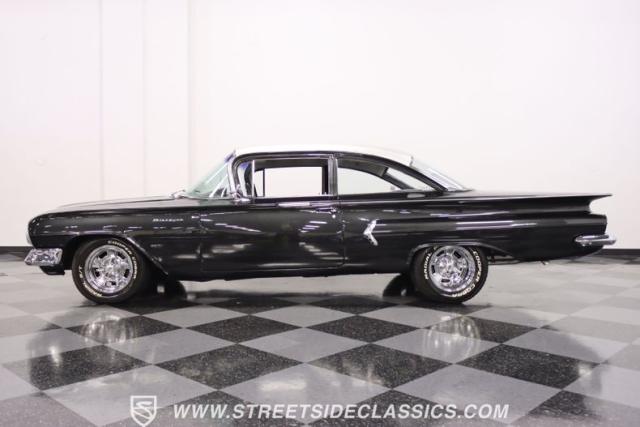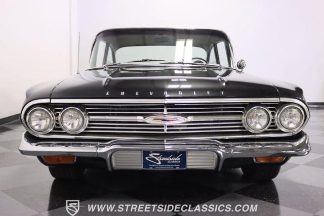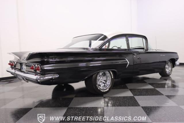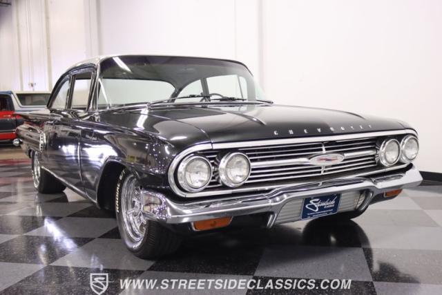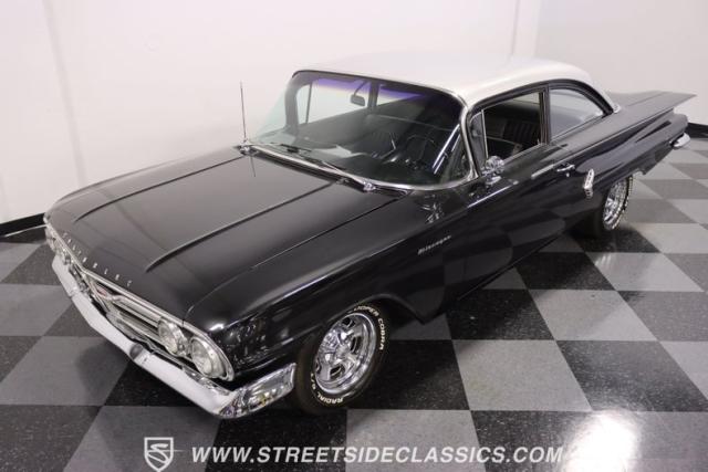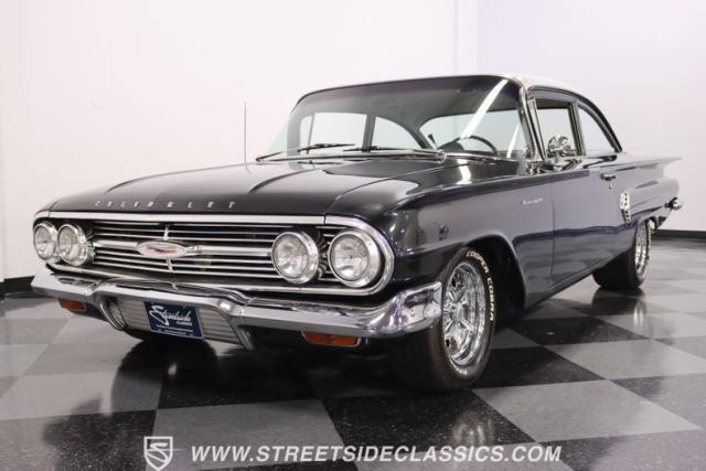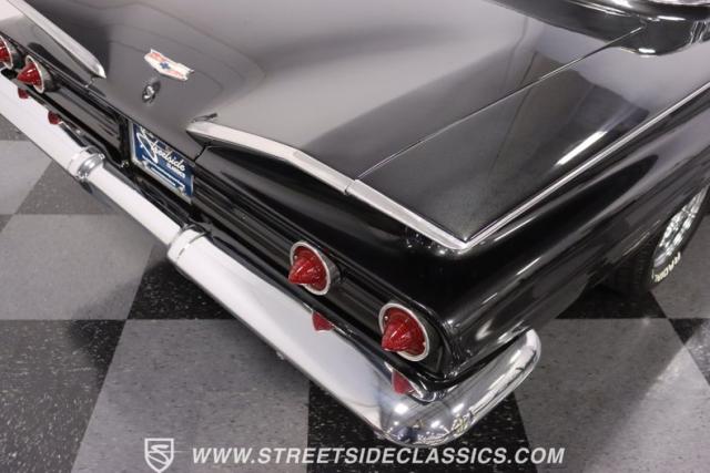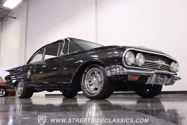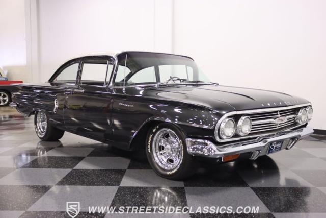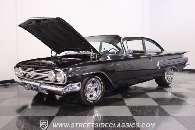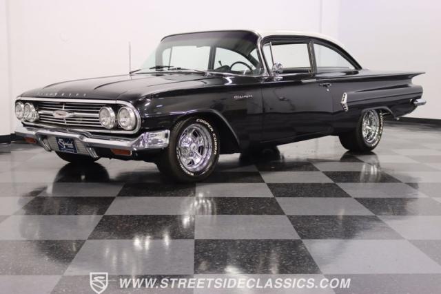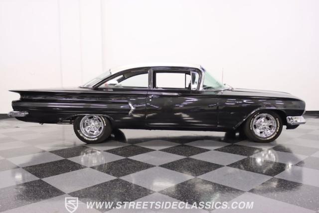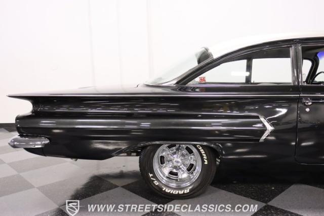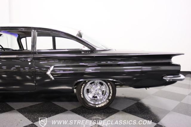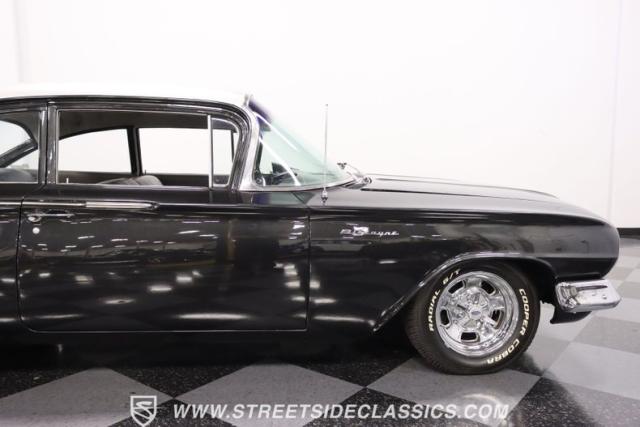 Lurking in the shadows, with a demeanor that whispers of midnight rides and the allure of the open road, this 1960 Chevrolet Biscayne Restomod blends craftsmanship with classic lines. Adorned in an intoxicating Black Diamond paint that captures the essence of a starless night, this automobile boasts a finish so rich, it seems to absorb light. Silver metallic accents crown its top, adding a layer of sophistication to its muscular frame. Rolling on 15\" Cragar wheels wrapped in Cooper Cobra tires-235/60R15 at the front and a more aggressive 295/50R15 at the rear-this Biscayne not only looks the part but also promises performance that matches its menacing stance, thanks to a meticulous restoration concluded around 2021.