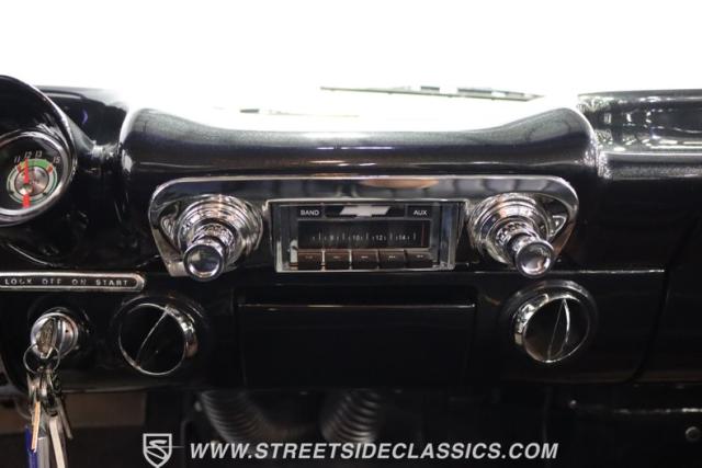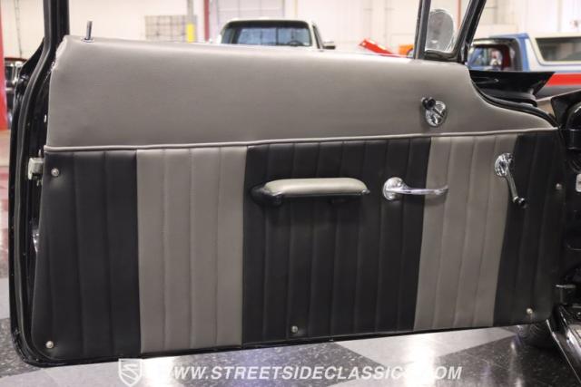 Within its cavernous interior lies a realm of black and gray. Black vinyl bench seating, accented with seatbelts, invites passengers to a comfortable reprieve, complemented by a gray velour headliner. The instrumentation-a mix of custom and classic-features some custom gauges peering back at the driver, offering a blend of functionality and aesthetic appeal. A custom, smaller steering wheel provides a tactile connection to the road, while the retro-style digital AM/FM radio fills the cabin with sounds from any era.