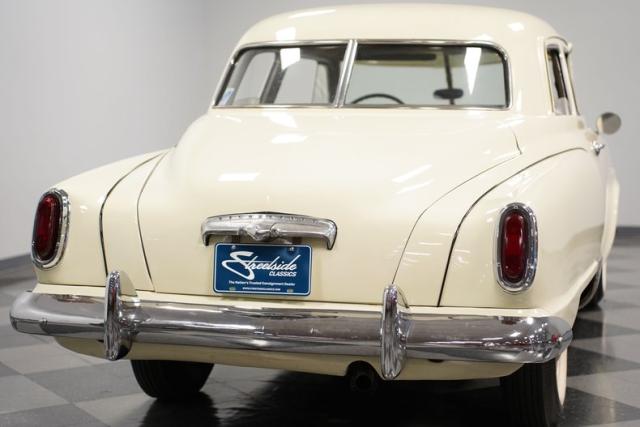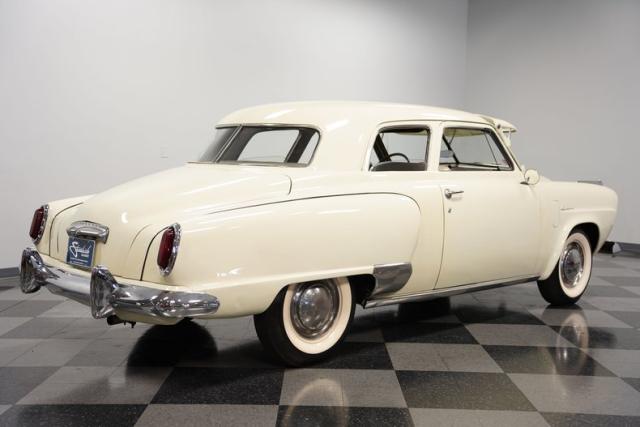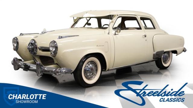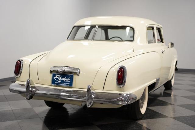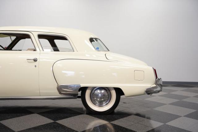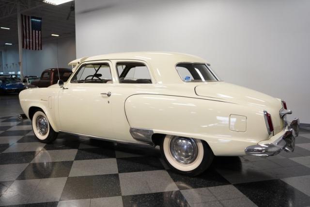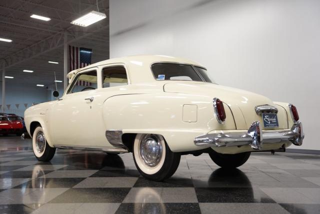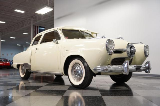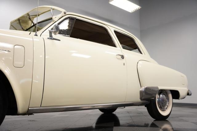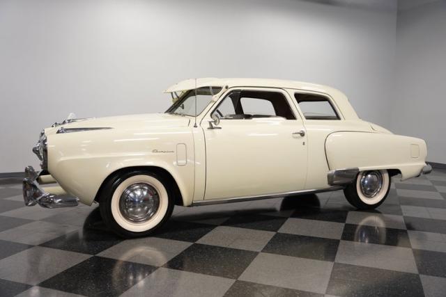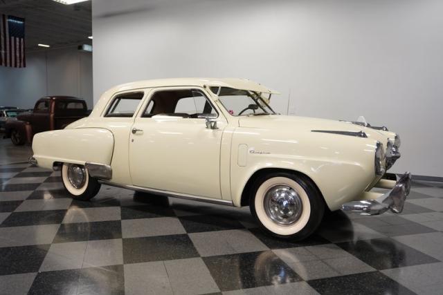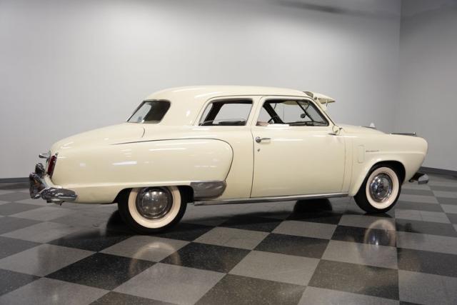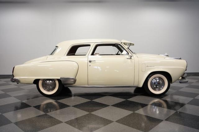 Launching into the essence of mid-century automotive design, this 1950 Studebaker Champion emerges as a gleaming beacon of innovation with its bullet-nose front end. This feature would become an icon of the Studebaker lineage. Coated in an almost Wimbledon white hue, its silhouette whispers tales of the era\'s aviation fascination, with the entire body poised as if ready for takeoff. Its stance, fortified by 15\" wheels shod in 6.70-15 tires, articulates a readiness to conquer the boulevards and byways alike. Among its exterior adornments, a visor adds a touch of sophistication. The ensemble of chrome trim proudly frames this Studebaker\'s visage, accentuating its historic demeanor.