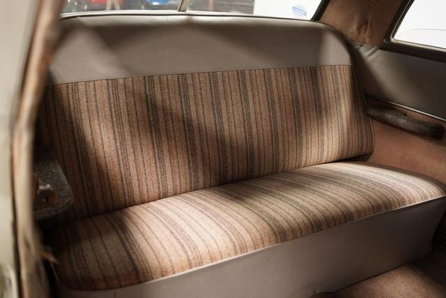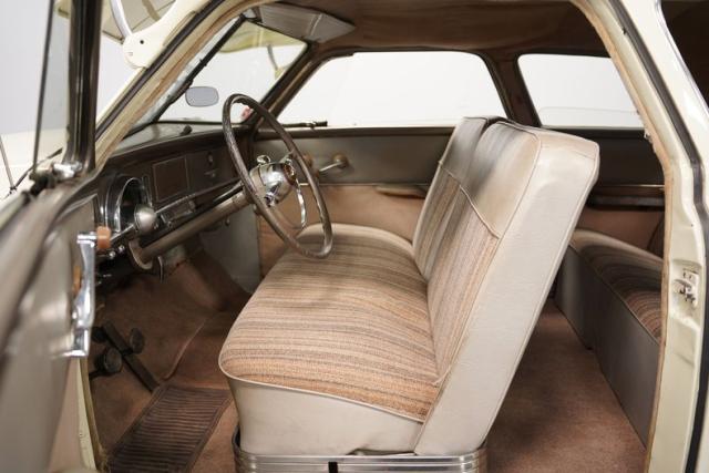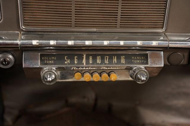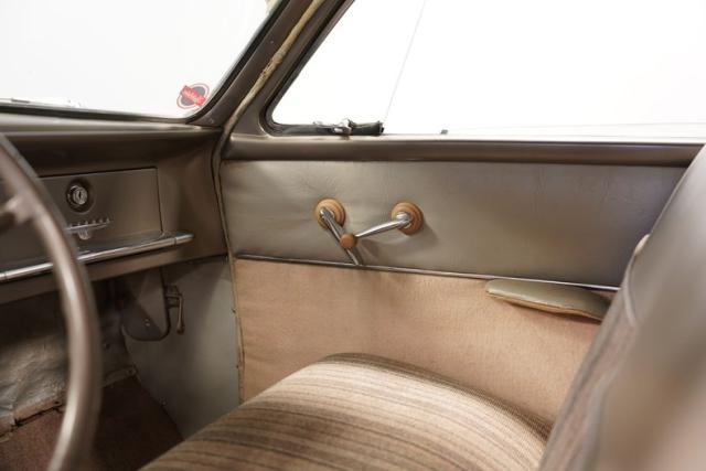 Venturing inside, the gray hues that blanket the cabin, from the vinyl and cloth bench seats to the dash and door panels, suggest an ambiance that is both inviting and reflective. The array of handles, knobs, and switches arrayed across the dashboard presents a tableau of functionality and charm. This scene is somewhat quieted by the silence of the AM radio that needs a little service, yet it adds to the Champion\'s allure, inviting the enthusiast to imbue it with new life.