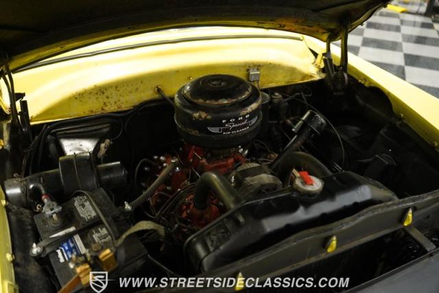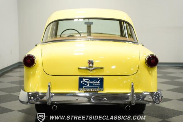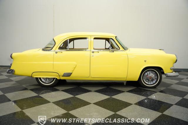 Yellow paint covers this 1953 Ford Mainline Fordor from a full repaint job. Chrome brightwork appears throughout, including bumpers, headlight assemblies, mirrors, and door handles. New rubber seals fit all glass for improved weather protection. Rolling stock consists of 15-inch steel wheels with chrome hubcaps, wrapped in P205/75R15 front and P205/70R15 rear radial tires.