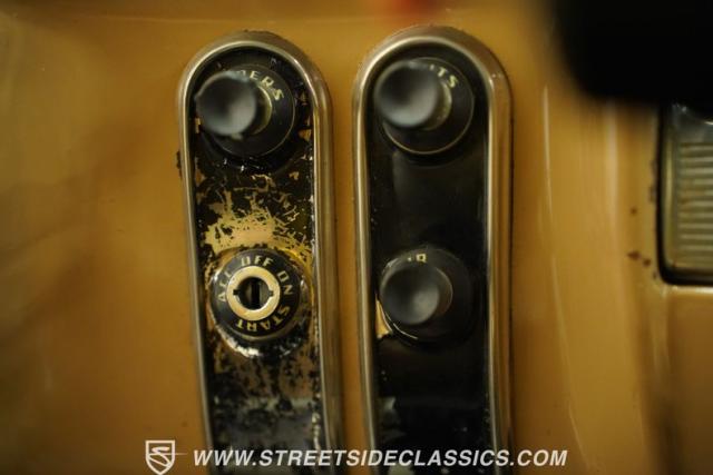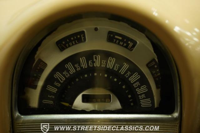 Tan vinyl with cloth inserts upholsters both front and rear bench seats. A special 50th anniversary Ford horn center cap adds historical significance. An updated turn signal assembly pairs with upgraded gauges showing temperature, oil pressure, and voltage. The factory AM radio remains installed. Simple controls and a clean layout provide an authentic driving environment from an earlier automotive period.