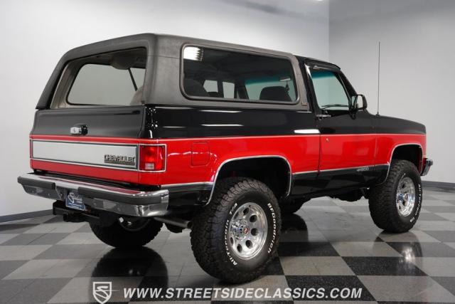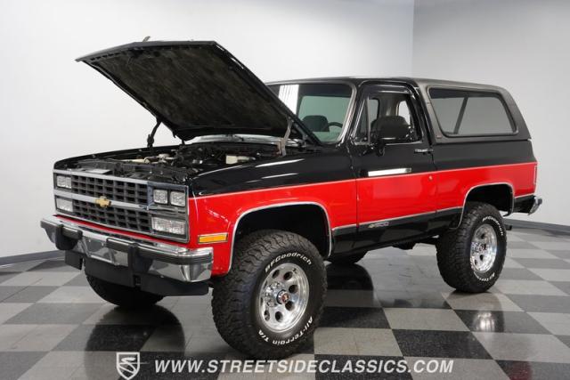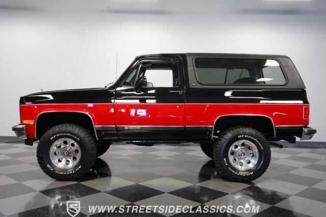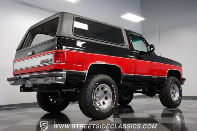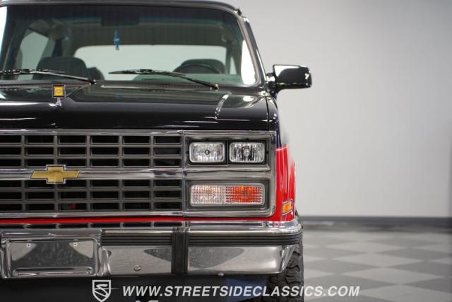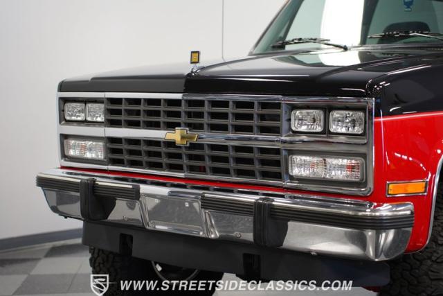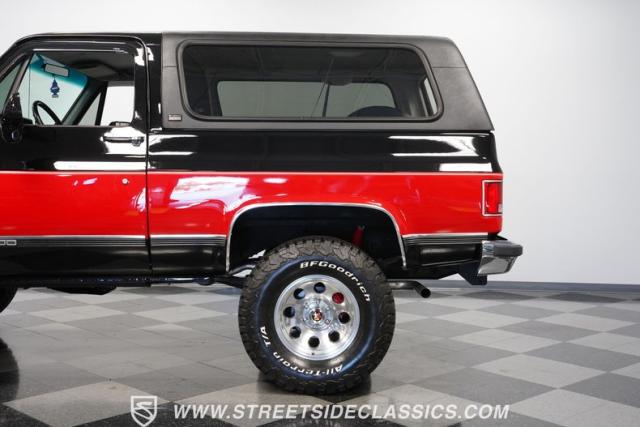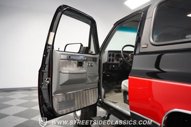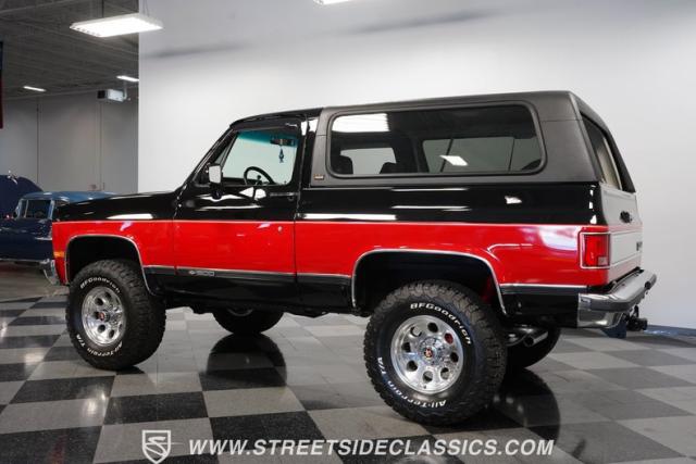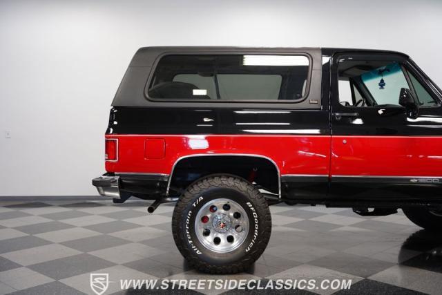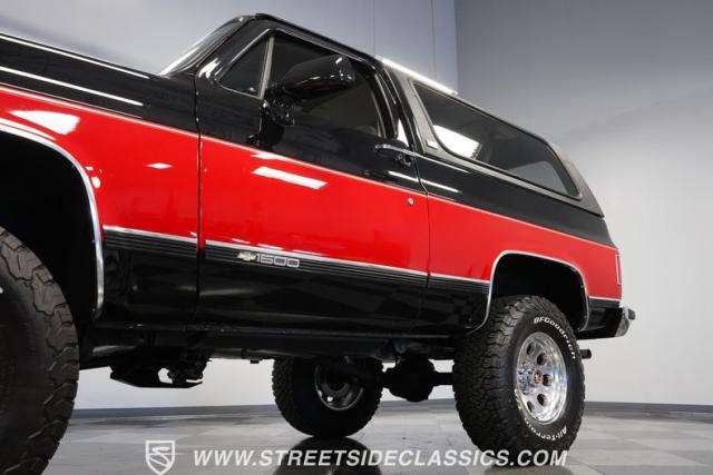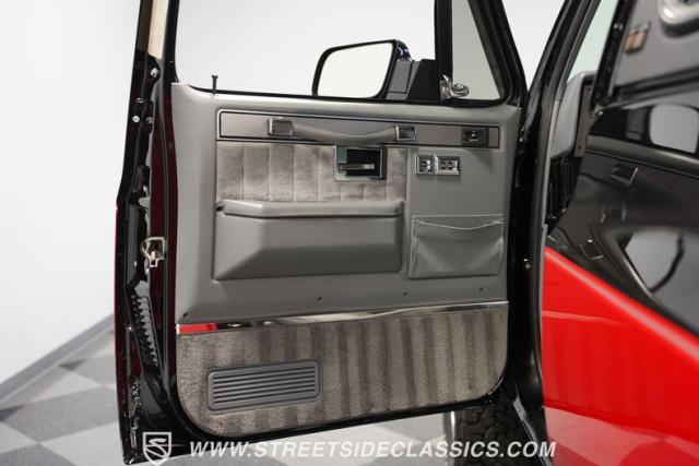 This K5 Blazer\'s black and red two-tone paint amplifies its muscular stance. The upgraded electric running boards extend automatically when the doors open, adding style and function. The fresh windshield installation enhances the front view, while custom 17-inch wheels wrapped in aggressive BF Goodrich 35X12.50R17LT tires signal this SUV\'s off-road capabilities. A modernized front end features upgraded headlights, and the grill\'s chrome finish gives this Blazer a bold presence. The lifted suspension showcases this 4x4\'s athletic posture.
