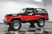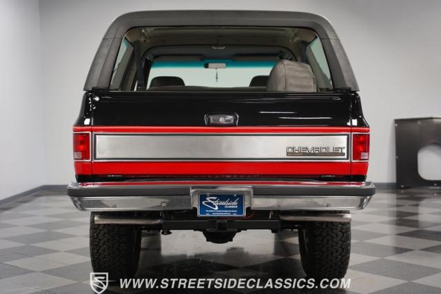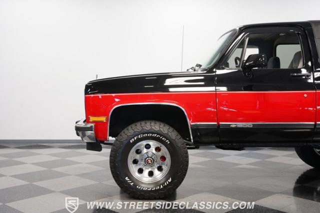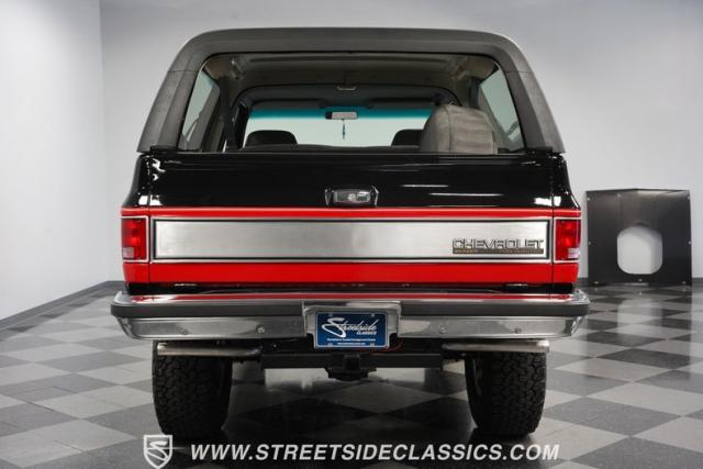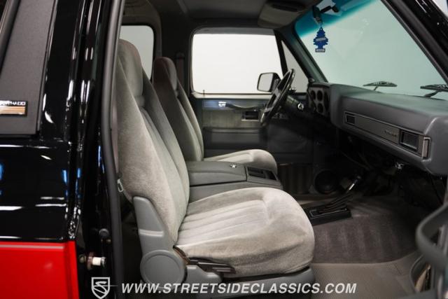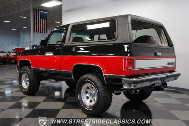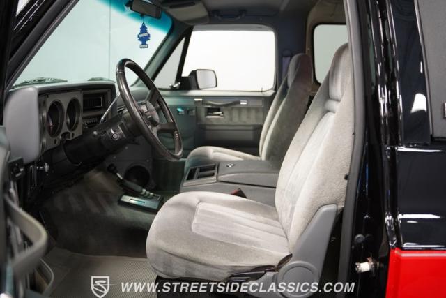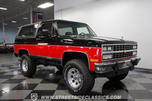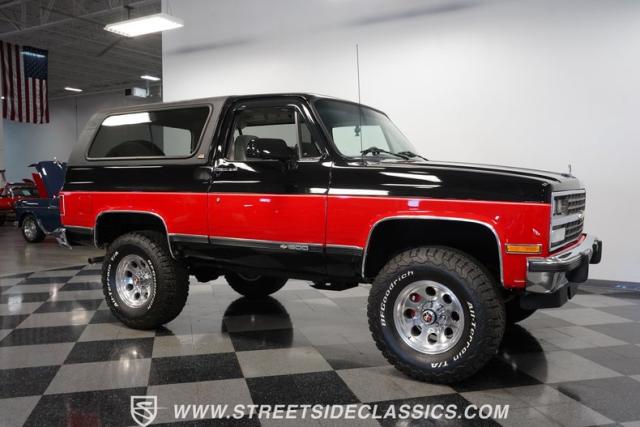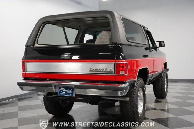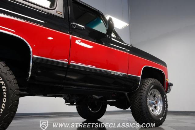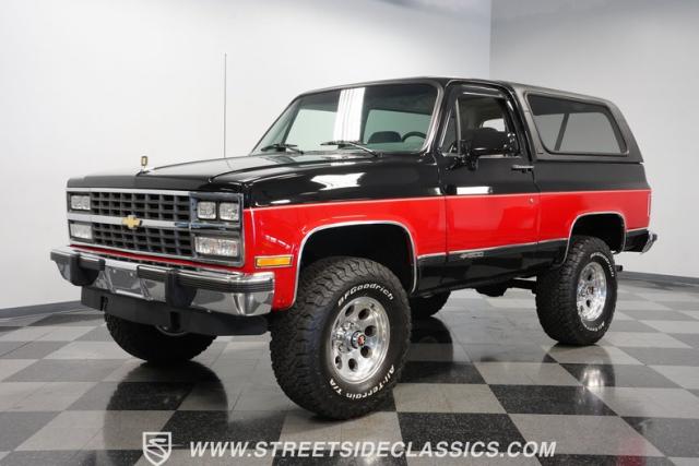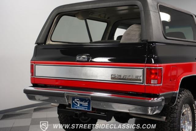 This K5 Blazer\'s black and red two-tone paint amplifies its muscular stance. The upgraded electric running boards extend automatically when the doors open, adding style and function. The fresh windshield installation enhances the front view, while custom 17-inch wheels wrapped in aggressive BF Goodrich 35X12.50R17LT tires signal this SUV\'s off-road capabilities. A modernized front end features upgraded headlights, and the grill\'s chrome finish gives this Blazer a bold presence. The lifted suspension showcases this 4x4\'s athletic posture.
