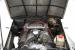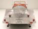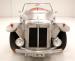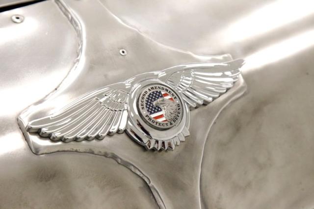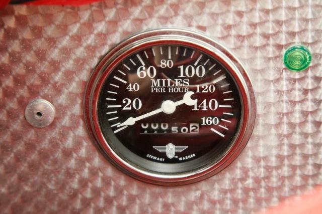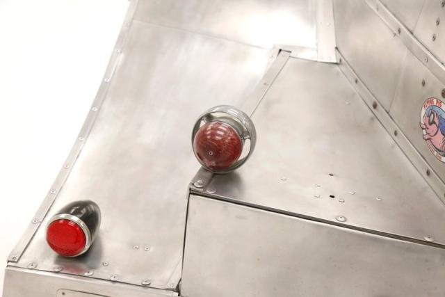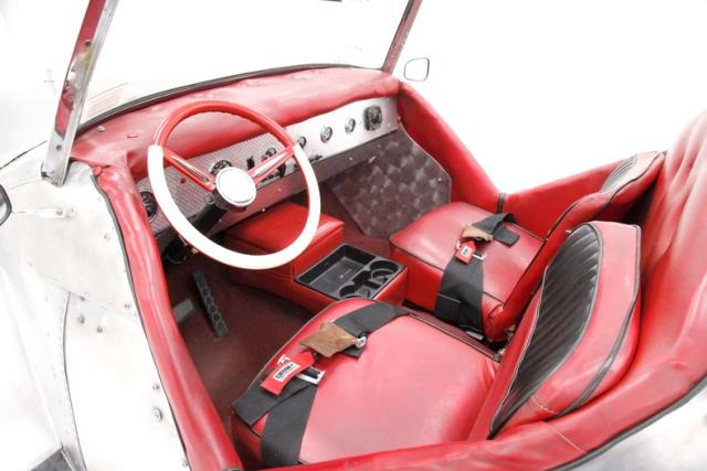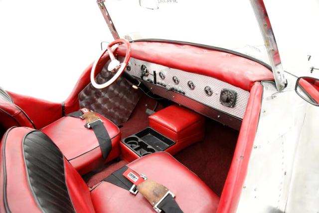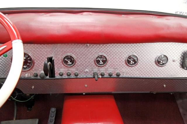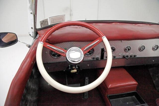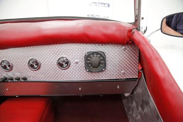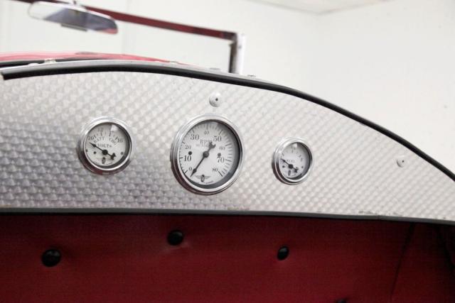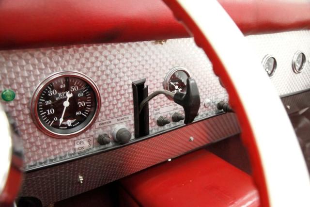 Taking a ride in this creation subjects you to the elements as there is no top. Just aircraft style seating with dual cockpits reminiscent of the Stearman biplanes of yore. Low back bomber style buckets, (fitting!), are in front facing the custom aluminum spun pattern dash. These chairs feature uppers with black tuck and roll and smooth red vinyl lowers. A large center console with a storage tray and cupholders is between the buckets. Padding covered in red vinyl lines the edges off the swooping down edged cockpit. That dash has blackface Stewart Warner black faced gauges with vintage looking pointers. A few additional knobs and toggles as well as some lights are inserted here as well. Fronting the dash is a vintage 50\'s styled steering wheel in white and red with a central chevron center. Red carpeting covers the floors. In the back, we can climb into a private full rounded back bench also in red vinyl with black tuck and roll toppers. The sides are also padded red vinyl but with no doors, it\'s a climb.